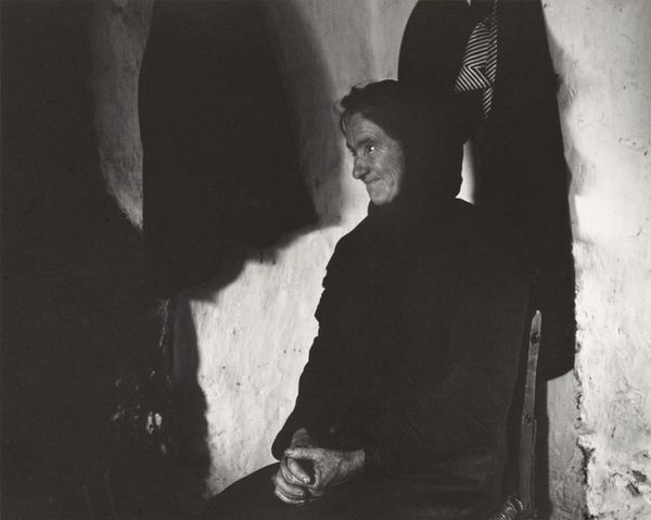 Editor: Dorothea Lange's photograph, "Egypt," from 1963, is incredibly striking in its simplicity. Shot in monochrome, it focuses on a woman partially concealed by what appears to be an old mud-brick wall. The textures are amazing, but the mood feels both intimate and somehow…distant. What do you see in this piece, beyond just the visual elements? Curator: Beyond the textures and stark contrast that grab your attention right away? I see stories whispered in the lines of her face. Consider what Lange, known for her empathetic approach to her subjects, especially during the Depression, might have been aiming for here. Do you think she was making a political statement or merely capturing a moment in time? I imagine this is more than "just" a portrait. The framing…it’s like a collaborative effort between the woman and the wall to conceal stories, lived realities. Editor: I think it could be both, couldn't it? She is clearly photographing a specific individual in a particular environment. It is hard to deny there is some truth she is conveying with that. What I mean is… How much do you think the historical context – mid-century ideas about women in the Middle East, for example – impacts how we should "read" this photo? Curator: Oof, that’s where it gets complicated. It would be tempting to label this as yet another example of the "Western gaze," reducing this woman to a symbol, an exotic other. And yet… I’m wrestling with the quiet strength in her eyes. Perhaps it’s less about Lange imposing her view and more about Lange acknowledging the complex resilience of this woman, her ability to persevere while holding her past close. It’s less a photograph of Egypt and more of a moment _in_ Egypt. I am getting chills. Editor: Yeah, I’m with you. So maybe instead of projecting, it is important that we focus on the collaborative… the shared human moment? This exchange has altered my original perception; there's way more going on here. Curator: Exactly. We often forget that art is not just a monologue but an act of witnessing, bearing with oneself the weight of one's experience. We’ve merely scratched the surface and that’s thrilling to me.