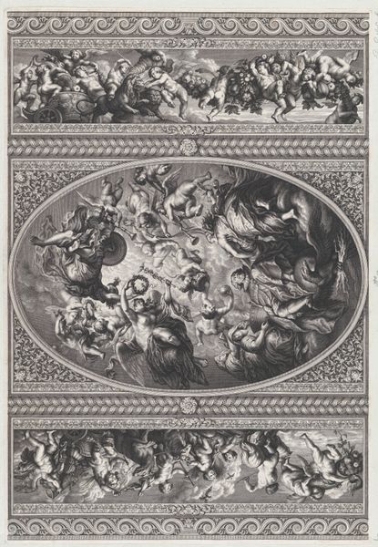 Editor: This is Laurent Cars' 1752 engraving after the ceiling painting in the Grande Galerie of Versailles. It depicts Louis XIV, King of France, positioned between Neptune and Mars. The work is incredibly detailed and seems designed to project power. What do you see in this piece, and how do you interpret it? Curator: This engraving serves as propaganda, carefully constructed to legitimize and solidify Louis XIV's reign through a symbolic representation of absolute power. Notice how he is centrally placed and elevated, drawing parallels to mythological figures. Neptune and Mars, gods of the sea and war, flank him, suggesting dominion over both realms. Editor: So, the work presents an idealized version of Louis XIV's rule? Curator: Precisely. It's crucial to analyze how power operates within this context. The figures surrounding Louis aren't merely decorative; they signify specific aspects of his reign – military strength, economic prosperity through maritime control, and divine right. Consider, though, whose voices are missing. Whose stories aren't being told in this grandiose depiction? Editor: The common people, perhaps? Or the perspectives of colonized nations impacted by French expansion? Curator: Exactly! By centering Louis XIV, the engraving implicitly silences the experiences of those marginalized by his rule. It’s not just a portrait; it’s an ideological statement about who matters and whose narrative is privileged. Thinking about visual representations critically forces us to examine historical and social systems that continue to perpetuate such power dynamics. Editor: This definitely provides a wider and needed critical lens on this iconic era of French history. I see so many layers to unpack here. Curator: Absolutely. That deeper engagement with such visual works, especially those created within systems of control, provides necessary pathways for dialogue.