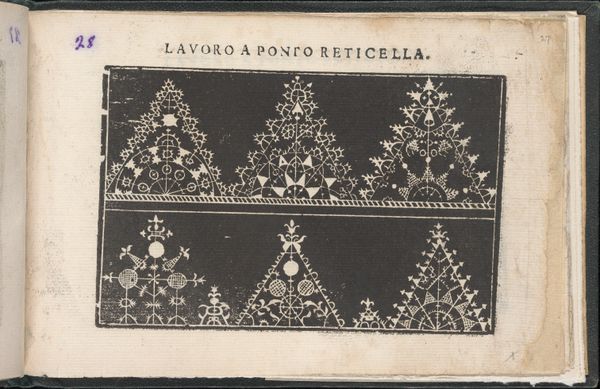 This is page two from "Gemma pretiosa della virtuose donne," or "Precious Gems of Virtuous Women," made by Isabella Catanea Parasole in the late 16th or early 17th century. This bookplate provides patterns for "Lavoro a Ponto Reticella," or Reticella lace, a geometric and highly-stylized needle lace popular at the time. Parasole was a printmaker and author, but also a professional lace maker and embroiderer. Through her pattern books, Parasole provided templates for women who practiced needlework, an art form that was admired, and a source of income. Note how Parasole's book is dedicated to virtuous women, but nonetheless provided designs for women to create their own businesses. Her book emphasizes the complex relationship between women, work, and virtue during the early modern period. Although decorative, lace also signified status and wealth, demonstrating the power of women’s labor in the economy. Consider how Parasole’s work challenges assumptions about gendered labor, while offering a glimpse into the domestic lives of women.