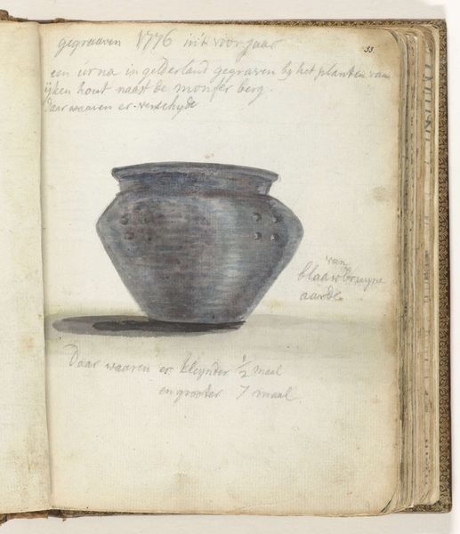 Jan Brandes created this watercolor drawing, "Olifantspauken en Maleise waaier," which translates to "Elephant Drums and Malay Fan." The work employs a straightforward composition, positioning two drums above and a fan below, emphasizing their shapes and textures. Brandes renders the drums with meticulous detail, capturing their rounded forms and the intricate patterns of their bracing. The watercolor technique lends a delicate texture, softening the drums' structure. The fan, in contrast, unfurls in a radial pattern, its painted surface adding color to the otherwise muted palette. This juxtaposition invites us to consider the artist's approach to representation. How does he use line and color to distinguish between the functional solidity of the drums and the decorative lightness of the fan? Ultimately, Brandes’ work destabilizes established meanings by prompting consideration of cultural artifacts, challenging us to decode the signs embedded within these objects. It suggests a space for ongoing interpretation and re-interpretation.