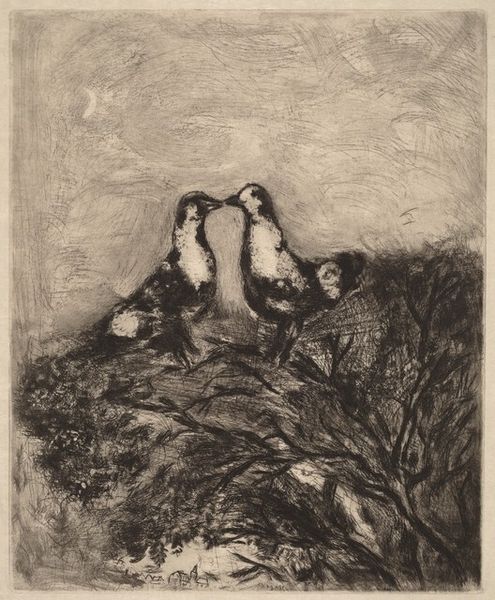 Editor: This is "The Eagle and the Owl," an etching by Marc Chagall, likely completed between 1927 and 1930. I'm immediately struck by its starkness and the contrast between the birds and the almost dreamlike background. How do you interpret this work, particularly regarding its potential symbolism? Curator: It's fascinating to consider how Chagall, with his Jewish-Belarusian heritage, situates these powerful birds within a broader context of cultural and political upheaval. The eagle, often a symbol of imperial power, and the owl, associated with wisdom but also darkness, become entangled in a delicate etching technique that emphasizes vulnerability. Could the opposition between these figures speak to the increasing polarization and anxieties of interwar Europe? Editor: That’s a really interesting point, considering the rise of nationalism during that period. The vulnerability you mentioned is evident in the fragile linework. So, do you think Chagall is specifically referencing the political climate, or is there a more universal message? Curator: I think both interpretations can co-exist. Chagall frequently interweaves personal and political narratives. By choosing these iconic birds, he engages with centuries of symbolic associations. However, the deliberate lack of grandeur, the almost melancholic atmosphere, and the fragile medium subtly undermine traditional power dynamics. What emotions do you think this scene evokes? Editor: There's definitely a sense of unease, like a quiet warning. The darkness of the ink and the uncertain landscape contribute to that feeling. Curator: Exactly. By understanding the socio-political context and the historical symbolism of the figures, we gain a more nuanced understanding of Chagall’s intentions. We are better equipped to assess this print, its symbolism, and what anxieties preoccupied the artist during this tumultuous time. Editor: That’s been incredibly insightful. I'll definitely approach Chagall's work differently now, with a deeper appreciation for its layered meanings.