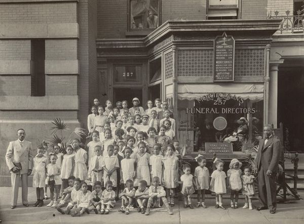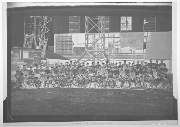 Editor: This photograph by Hamblin Studio shows a large group gathered in front of a building. It's striking because the figures seem almost spectral due to the photographic process. What historical narratives might be embedded in this image? Curator: Consider the uniformity of dress. Is this enforced or chosen? Who is excluded? How does the architecture reinforce or challenge the power dynamics at play within this group? What can this tell us about the social fabric of its time? Editor: That's fascinating! The building does seem to loom over the people. It's like the architecture is another character in the photograph, defining the space and, perhaps, their roles within it. Curator: Precisely. And the very act of assembling for a photograph, then, becomes a statement, a claim to visibility and perhaps even a resistance against erasure. We can learn so much by understanding historical context. Editor: I see what you mean. Thanks for offering that context. It's given me a whole new perspective on the image.