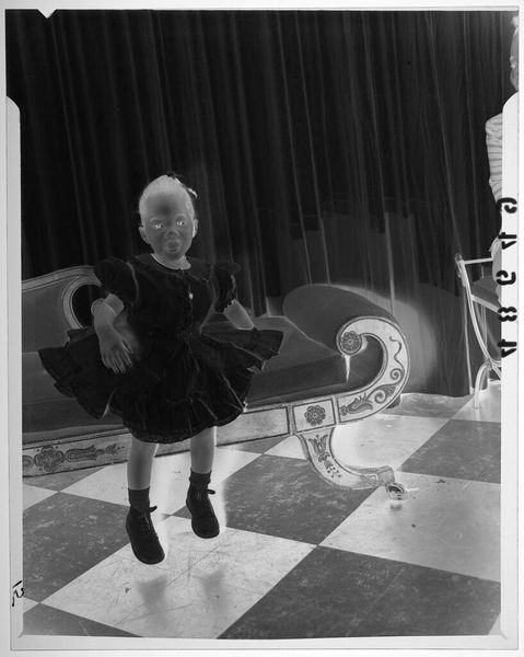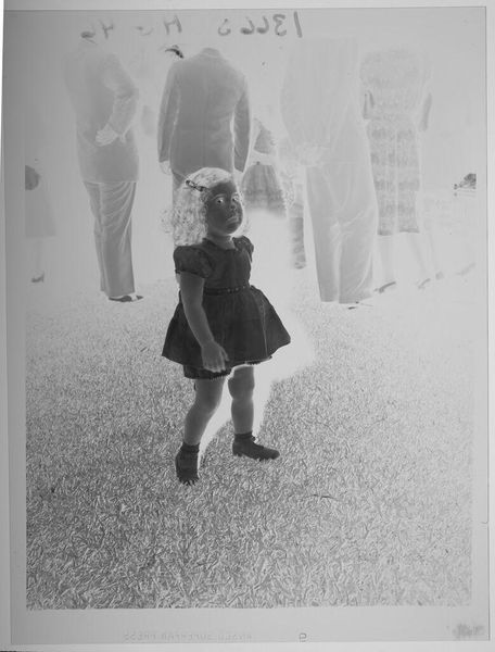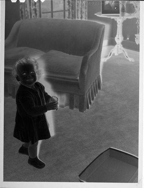Curator: There's an unsettling feeling about this photo. It’s titled "Untitled (young girl in dress posed holding toy in fancy room)" by Martin Schweig, part of the Harvard Art Museums collection. The negative's starkness creates a strange atmosphere. Editor: The material qualities stand out. The photographic process itself, the darkroom manipulation, the film grain, all contribute to the image's unsettling quality. How does the medium impact our understanding of childhood and portraiture? Curator: Well, toy cameras often symbolize innocence, but here, the reversal emphasizes the uncanny, the disquieting aspects of childhood. The girl's gaze, the reversed image, almost feels like a haunting. Editor: Right, and the opulent room contrasts with the child's simple dress. It seems to highlight class differences. This isn't just a simple portrait; it's a social statement made through the very act of capturing this image. Curator: Perhaps Schweig wanted us to confront our idealized views of the past and the visual symbols we use to represent them. Editor: It certainly challenges expectations. Even the photographic process becomes a commentary. It makes you question the roles of wealth, class, and visual representation.