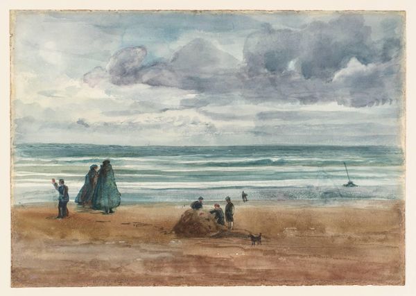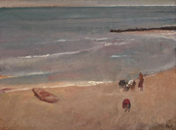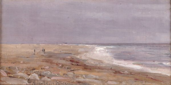 Curator: Before us is "Highland Light, North Truro" by Denman Waldo Ross, currently residing at the Harvard Art Museums. Editor: It feels so…empty. That vast expanse of white, like a stage set for a forgotten play. Curator: Ross was deeply invested in the formal elements of art. Note how the almost crude brushstrokes and limited palette reduce the scene to its essence, focusing on the interplay of light and form. The sand, the sea, the sky, these are nearly abstract blocks of color. Editor: But that small figure in the water – that's what draws me in. It's like a tiny human counterpoint to the immensity of nature. I wonder what they're thinking, or feeling? Curator: Considering the labor involved in procuring and mixing paints at the time, we can see this economy of color as a conscious choice, perhaps a reflection of the constraints and aesthetics of its time. Editor: Maybe, but I think there's a certain tranquility in that simplicity. It's the kind of scene that makes you want to breathe deep and let go of everything. Curator: Precisely. It invites us to consider not just what we see, but how it was made and what resources went into its construction. Editor: Ultimately, it’s a meditation on place and presence. Curator: Indeed, a work that speaks volumes through subtle materiality.