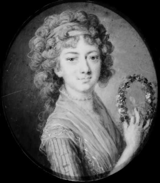 Curator: We’re looking at "Eleonore Sophie Rantzau, a gift in 1796 to lensgreve Preben Bille-Brahe," a miniature created by Cornelius Høyer between 1794 and 1798. Editor: It’s striking how much emotion is captured in such a small, delicate object. It feels almost melancholic, doesn't it? Curator: The subtle tonal gradations in this work contribute to the soft modelling of the subject’s face. Høyer uses delicate brushwork to create a sense of depth. The oval shape directs our gaze. Editor: And the pearls framing the miniature amplify its symbolism as an object of affection and esteem. Pearls, often associated with purity and wealth, seem to signal status and marital connection, doesn't it? Perhaps a gift to commemorate her wedding. Curator: Precisely. The composition’s symmetry is reinforced through the carefully balanced placement of the pearls, creating visual harmony. Editor: This black and white theme actually adds a certain gravitas; stripping away color concentrates the viewer on expression and form. How intimate this object must have felt when gifted between lovers, don’t you think? To carry around an image of someone dear as if they were present with you always. Curator: The formal rigor, however, speaks of the academic artistic style of the time—a portrait fulfilling its commission in representing an ideal of beauty rather than pure sentimental expression. Editor: Even within that formality, her softly curled hair and draped clothing evoke a sense of ease and vulnerability that surpasses simple societal representation. She’s an individual despite the constraints of the era. Curator: I agree; Høyer found a remarkable balance, imbuing an image with human emotion within its stylistic and material confines. Editor: It allows us to reflect on how personal mementos carry historical weight.