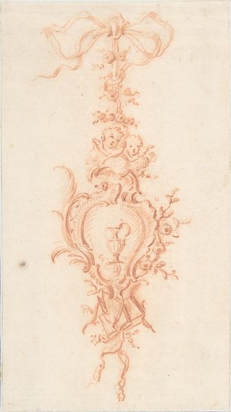 Curator: A preliminary sketch can be incredibly evocative, can't it? My first thought is that the scale feels somehow monumental, even in this simple, linear form. Editor: This is René Charpentier’s “Design for Trophy,” likely created between 1695 and 1723, currently housed here at the Met. It gives us an intriguing insight into Baroque design sensibilities through the medium of drawing. Curator: "Trophy" suggests commemoration, and immediately my eye is drawn to the combination of religious and aristocratic symbols – the angels, the cross, the crown... The little structure within the cartouche reminds me of a reliquary, hinting at the preservation of sacred relics. Editor: Precisely. Note also the texture created by the red chalk. Each line conveys information about light and shadow, even at this preparatory stage, informing the artisans tasked with rendering these sketches into three-dimensional, opulent, material objects. Curator: And consider the intended psychological effect! Trophies inherently deal with power, victory. But what kind of victory are we talking about here? Is it earthly, or something more...spiritual? Perhaps even, both woven together, the visual rhetoric carefully planned. Editor: Given the time and context, the labor and the commerce certainly would be tied up in workshops supported by aristocratic patronage. Knowing how intertwined the social was with the ecclesiastical then really contextualizes the fusion of those symbols. A "divine right of kings," perhaps, visually codified through material processes? Curator: Indeed. It serves as a reminder that symbols aren't neutral. They are intentionally crafted, meticulously rendered, imbued with layered meaning that resonates even centuries later. The emotional heft of these forms persists, echoing the long, complicated dance between temporal authority and spiritual aspiration. Editor: So, even in what appears to be a preliminary drawing, we get a real glimpse into the economy and meaning constructed around object making then, and how even drawings act as significant nodes within these larger systems of cultural production. Curator: Yes, thank you, I hadn't quite seen it that way before, an initial manifestation and key part of these economic and artistic endeavors. Editor: Exactly, there is so much happening in plain sight.
