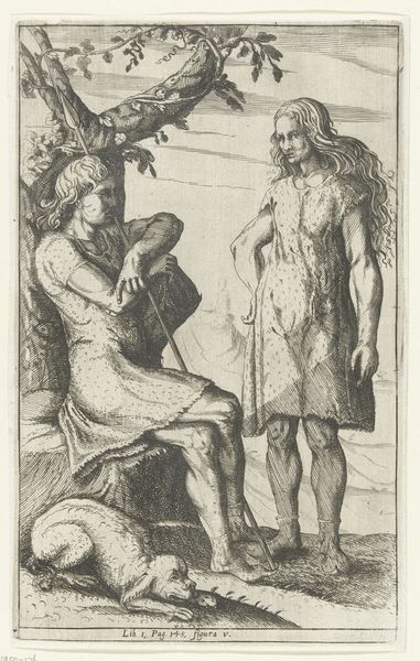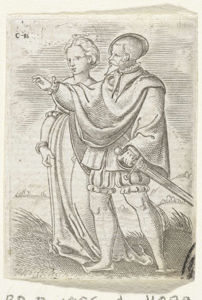 Cornelis Bos created this engraving, Dansend stel, de vingers met elkaar vervlochten, at an unknown date. This image of a dancing couple with fingers entwined offers a glimpse into the social dynamics of 16th-century Northern Europe. Made in the Netherlands, the print reflects the era's evolving social codes around courtship and public displays of affection. The couple's attire and the landscape setting provide clues about their social standing and the cultural values of the time. The male figure’s sword can be seen as evidence of status. Bos, as a printmaker, played a role in disseminating such images to a broader public. The availability of such images contributed to the circulation and negotiation of social norms. To fully understand this work, one can consult historical archives, costume studies, and social histories of the period. This engraving serves as a reminder that art is deeply embedded in its cultural and institutional context.