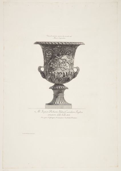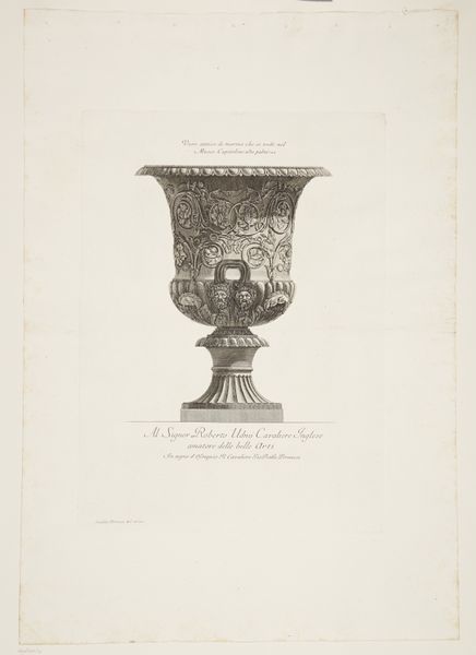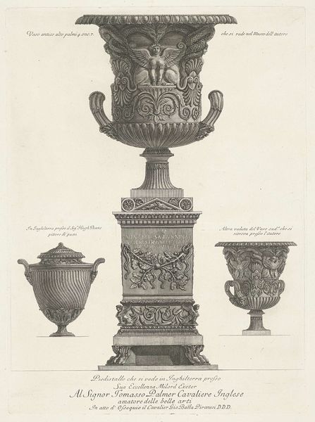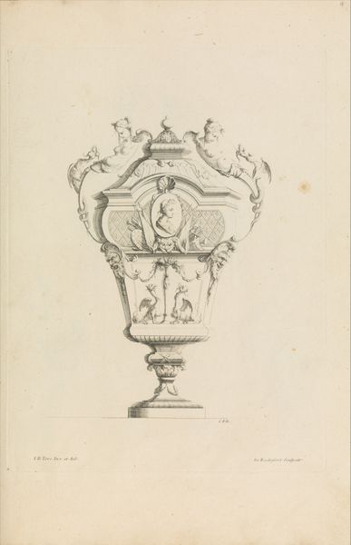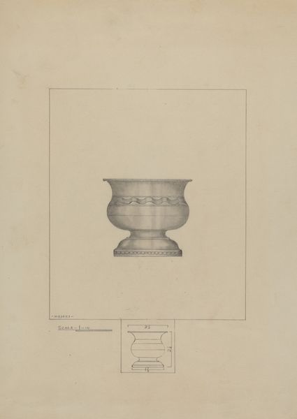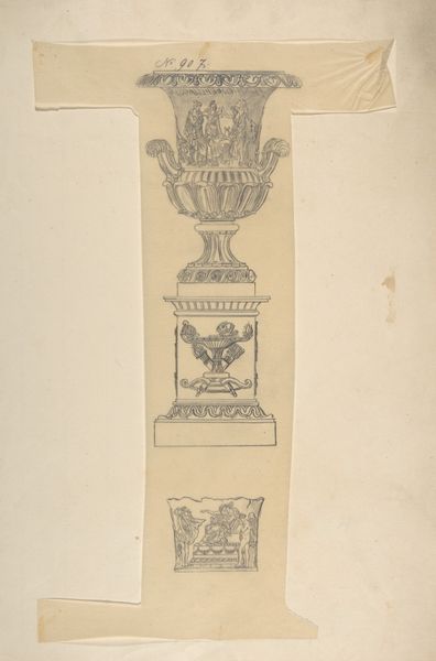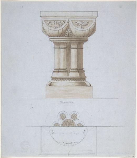 Curator: This drawing, "Romanesque Style Font and Plan," made anonymously sometime between 1840 and 1870, offers a meticulous design for a baptismal font. The media? Pen and ink with a subdued color palette. Editor: Immediately, I am drawn to the geometric clarity and those meticulously rendered ornamental details. The interplay of curves and sharp angles creates a striking visual balance. It almost feels like peering into a three-dimensional mathematical equation. Curator: Absolutely. This wasn't just an artistic exercise, though; it speaks to the architectural revival movements of the 19th century. There was a renewed interest in earlier periods, particularly the Romanesque style with its sturdy, grounded aesthetic and religious associations. Notice the arches; they are a hallmark of Romanesque design. Editor: Yes, and the tiered structure. My eye travels upward from the base to the bowl, the weight gradually lightening to focus our attention there. And those swirling decorations, the symmetrical leaf carvings--how interesting their rhythm and placement. I sense something powerful in how the various visual textures combine. Curator: Consider the social function too. Fonts are not merely decorative elements; they're central to religious rites, specifically baptism and initiation into Christian communities. It highlights the relationship between art, ritual, and societal values. The baptismal font serves as both a physical and symbolic gateway. The design shows how such architectural objects served the state as much as religion. Editor: And perhaps reveals much more about what architectural order represents within an era grappling with identity, something beyond merely functionality? Looking closely at line quality and its deliberate curves--there’s evidence of intention. This speaks not only to architectural construction, but how designers wanted it to feel on a conceptual level for people. Curator: An insightful point; studying this work reminds me that aesthetic tastes, like everything else, reflect shifting cultural norms. It provides a visual manifestation of this Victorian-era obsession with past architectural languages. Editor: Yes, that kind of perspective certainly casts new light on artistic output.
