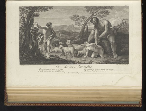 Editor: This is "Jacob and Rachel," an engraving by Christian Ernst Stözel, from 1833. It’s quite striking; the figures seem caught in a moment of profound emotion. How do you interpret this work, especially in relation to its cultural context? Curator: The image teems with layered meanings, doesn't it? Notice how the well acts as a symbolic focal point, an archetypal meeting place. The figures are positioned around it in a way that evokes both connection and constraint. The Romantic style is infused with history-painting sensibilities. Does the positioning of Rachel carrying her jug while holding Jacob resonate with other images you’ve studied? Editor: I see what you mean, the jug does emphasize Rachel's role, but it also points to a deeper symbolic resonance. Is the water jug representing feminine virtues? Curator: Precisely! The water symbolizes purity, life-giving properties, but there's more at play. Consider the psychological weight of wells and water in stories. The subconscious associations often include transformation, revelation, or a fateful encounter. Are these present here? Editor: I definitely sense the revelation, given their intimate exchange by the well. Also the witnesses on the left, lounging and watching, give the scene an operatic tone. I guess the little cherub kid could suggest fertility? Curator: That is correct. So many elements function as symbolic shorthand! We must understand such imagery in the 1830s in Germany had everything to do with the project of constructing nationhood, or how people could relate to grand narratives. Editor: It’s fascinating to consider how symbols evolve over time, and Stözel using well-known imagery and embedding it in a landscape of burgeoning Romantic nationalism adds so much depth. Curator: Exactly. Symbols offer us portals into the cultural memory.