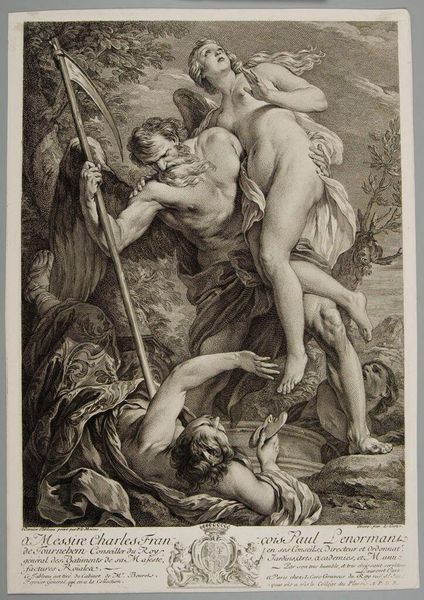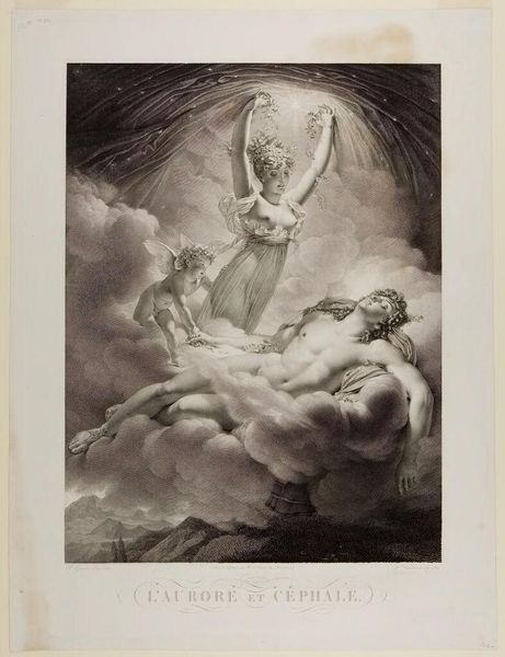 Editor: This is Frans van der Steen's "Jupiter and Io," housed at the Harvard Art Museums. The soft, smoky lines create a dreamy mood. What symbols stand out to you? Curator: The metamorphosis of Jupiter into a cloud, obscuring his form, speaks volumes. Clouds often symbolize divine presence or concealment. Io, gazing upwards, represents mortal desire and vulnerability. Do you see how the bull at her feet anchors the scene? Editor: Yes, the bull feels very grounded compared to the ethereal cloud. Curator: It’s a visual anchor, linking Io to her earthly fate and Jupiter's transformation. The artist uses these symbols to portray the push and pull between divine power and human consequence. Reflect on how similar themes echo through art history. Editor: That's fascinating. I’ll definitely look for that in other works now.