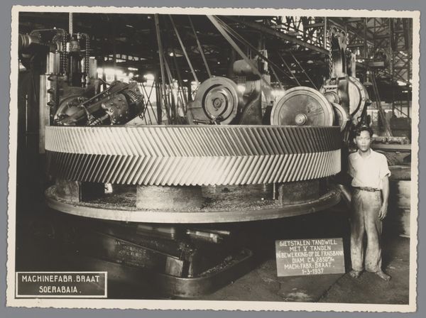 Editor: This intriguing monochrome photograph, "Tandwiel voor rietloskraan," potentially dating from 1931 to 1934 and held at the Rijksmuseum, captures a gearwheel for a reed unloader. I'm struck by the sheer scale and weight of this industrial object; it feels both powerful and strangely beautiful. What catches your eye, and how do you interpret this work? Curator: Oh, it's a beautiful behemoth, isn’t it? The photograph has a sort of honest charm. The starkness of the monochrome, that relentless realism…it shouts about the age of industry, but quietly. Notice how the artist—likely an anonymous factory photographer—isn't trying to prettify or romanticize the machinery. The details are what make it sing – the texture of the metal, the oil stains, the frankly overwhelming size of the gear. It makes you wonder about the human cost that went into creating these enormous parts, right? How would you connect it with other genre scenes of its time? Editor: It feels quite different from, say, pastoral landscapes that idealize rural life. This feels much grittier and grounded. The sign also provides another layer. Curator: Precisely! And consider what was being made at this time: The machine. Something to perhaps help make more things. The photo almost unintentionally acknowledges both human ingenuity, and the sheer weight of technological progress. Makes me a bit thoughtful… Editor: It does. It's more than just a record; it's a statement. I'm rethinking how I view industrial photography now! Curator: That’s the magic of really *seeing* something. And I might add, everything carries intention! Keep your curiosity kindled.