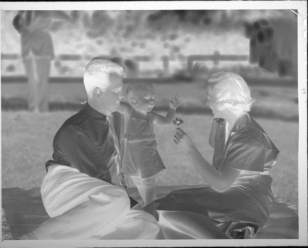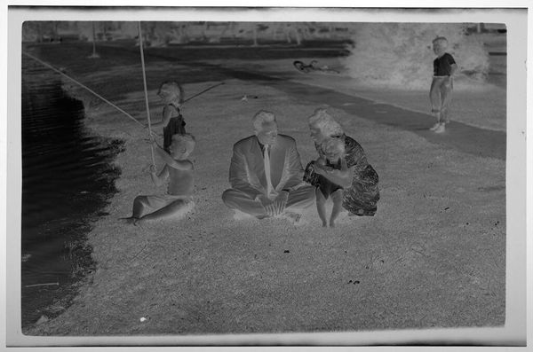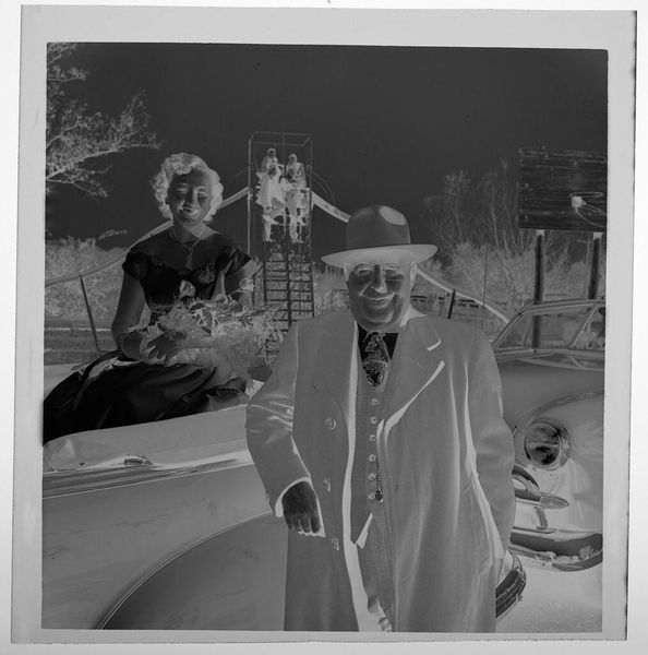 Curator: What immediately strikes me is the stark contrast—the interplay of light and shadow creates a rather haunting atmosphere. Editor: Indeed. Here we have an untitled photograph by Jack Gould, currently held at the Harvard Art Museums. It depicts two women on a park bench, one wearing a hat. Its modest size, about 3 by 4 inches, belies its complexity. Curator: The composition is interesting. Note how the dark foliage in the background frames the lighter figures. It almost feels staged, a commentary on social performances. Editor: Perhaps. Or it simply captures a moment of leisure, reflecting the social norms and available public spaces. Photography allows for those public moments. Curator: I see it as more than a snapshot. The inverted tones and the deliberate framing suggest a deeper narrative, a critique of societal expectations projected onto women. Editor: I am not sure it's quite that direct. But this piece certainly opens up interesting questions about the function of portraiture and its engagement within society. Curator: Yes, there is more here than meets the eye. Editor: Agreed. It's certainly thought-provoking.