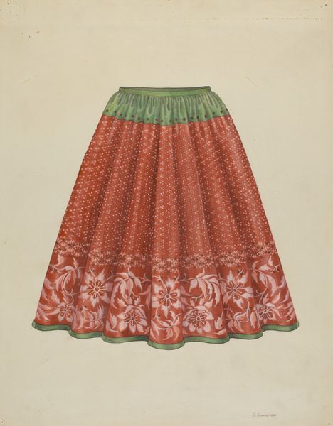 Curator: Here we have "Shaker Work Apron," a watercolor and drawing on textile made around 1936. My first impression is the color. It’s a beautiful umber, earthy, grounded. Editor: Absolutely. The Shakers were a utopian religious sect devoted to simplicity and utility. This apron represents that ethos. The image may feel unassuming, but consider the gendered history embedded in it. Shaker women's labor sustained their communities. Curator: It’s funny how utilitarian objects can become almost… meditative in their simplicity. This is like a visual haiku, you know? I’m picturing the quiet swish of fabric and a comforting, rhythmic hum from a sewing machine. Editor: That resonates deeply. It speaks to a kind of quiet domestic resistance. The aprons would have provided a certain level of protection and also an aesthetic for work. Wearing them allowed women to participate in the aesthetic world while fulfilling their domestic duties, so the apron transforms into this symbol of everyday emancipation. Curator: And there’s a lovely austerity to the piece itself. Just the barest hint of those pale blue pinstripes along the hem and bib—almost a whisper of ornamentation. You know, in another life, I think I was an obsessive minimalist Shaker with an inexplicable longing for lavender. Editor: What I also appreciate here is the artist’s engagement with texture and form. See the soft pleats and folds; how the fabric moves? We glimpse the artistry infused in even the most "humble" crafts. Curator: You know what this apron really whispers to me about? Making do, and in that process finding your own strange kind of grace. We're making do, still today, in so many ways. I love it! Editor: It's a call for us to reflect on the unseen labor—often gendered and racialized—that upholds our own lives. To really see it, honor it, and ask ourselves who and what enables us to flourish.