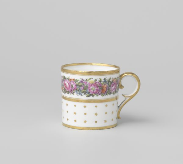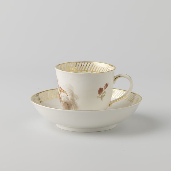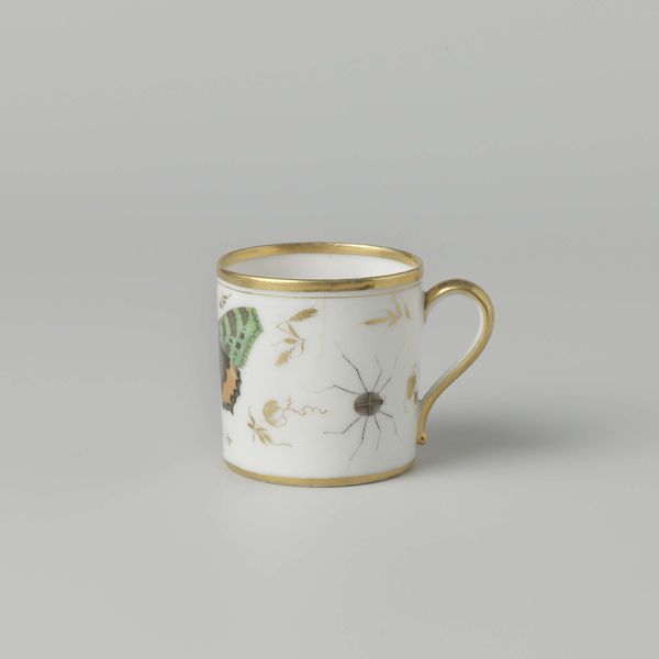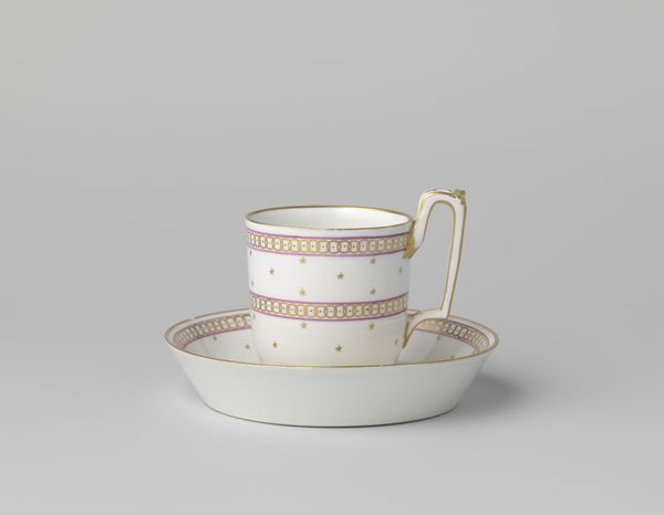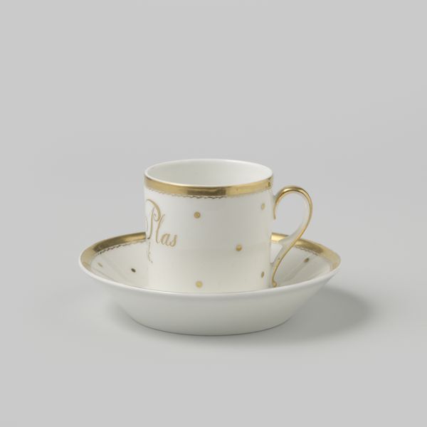 This is a cup with a handle, made by Louis Regout. Regout lived in the 19th century, and the design of this cup reflects the era’s fascination with luxury. The intricate black and grey border is highlighted by the addition of gold trim, indicative of the rising wealth of the bourgeois. Consider the social rituals around tea and coffee drinking during Regout’s time. It was often a gendered space, where women would gather to reinforce their social bonds and share news. This cup speaks to the performance of class, gender and domesticity. The act of drinking from such a delicate object was part of a broader social theatre, indicative of a certain refinement. Think about the hands that may have held this cup: What were their stories? What secrets and confidences were shared over steaming cups of tea? This simple object holds a wealth of untold histories.