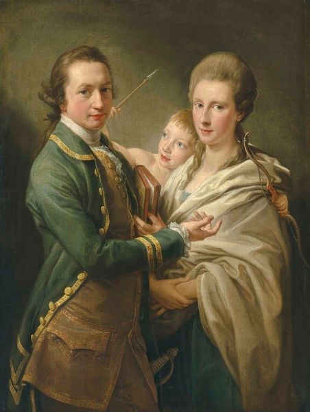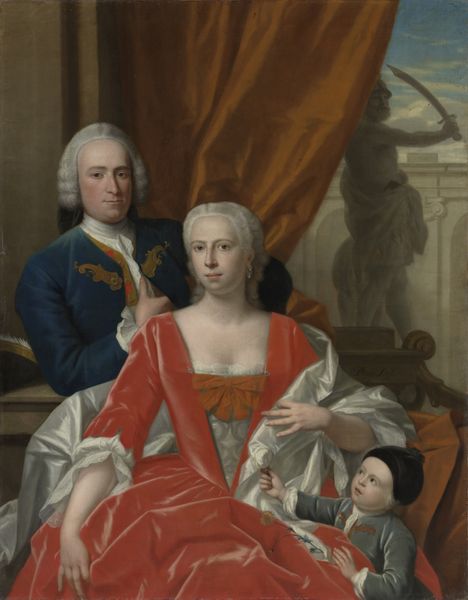 Curator: Nicolas de Largillière likely rendered this portrait in the early to mid-1700s; it’s currently known as *Madame Bertin and Her Son, Balthazar Bruno.* De Largillière was, of course, highly sought-after among the Parisian upper classes. Editor: It feels…staged, wouldn’t you say? Yet opulent in its formal declaration, with an element of a Rococo-style family tableau—though more monumental in size and tone. Curator: Indeed, this particular configuration of mother and son carries specific weight. Madame Bertin is not only signaling her own status, but mapping out the social trajectory she envisions for her son. Think of the sphinx in the background. Editor: Ah, that is a nice touch. It's an evocative, mythical symbol promising both enigma and power! The visual rhetoric speaks volumes; the sphinx could even be read as a nod toward intellectual dominance and societal strength, which she is determined to impart to her heir. It’s interesting how those neoclassicizing touches—the sculpture, the architecture—frame them in a more timeless way. Curator: Exactly! Then look at how Madame Bertin gestures outward, almost bestowing her son, and the family lineage, to the world. It reads like a carefully constructed piece of political messaging as much as it is a portrait. Her gown almost merges into his flamboyant red coat; she's literally enveloping him with her influence, making sure that her sphere becomes his own. Editor: What strikes me most is the power dynamic visualized; despite the apparent familial tenderness, there’s something undeniably performative and prescriptive happening here. We’re getting a glimpse of the machinery of aristocratic society. Largillière is giving us not just a portrait, but also a carefully orchestrated power play—mother crafting the future by orchestrating her child's image in her mold. It’s a subtle commentary on inherited privilege and expected social roles. Curator: Agreed. Looking closely, one detects the societal architecture hidden in the garments and gestures. Thank you for making these observations! Editor: Thank you; these dynamics shape, quite literally, the pictures of society!