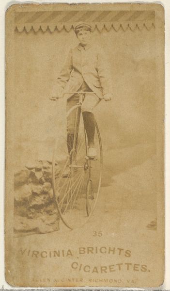 Editor: Here we have "Card 49, from the Girl Cyclists series (N49) for Virginia Brights Cigarettes," created by Allen & Ginter in 1887. It's a lithograph, a type of print, and the subject matter really gives off this "sporty" kind of vibe. What catches your attention in this piece? Curator: The immediate thing that stands out is that this is, at its core, advertisement. To consider it merely ‘art’ overlooks the labour and material conditions of its production. We should be looking at the convergence of industry, leisure, and consumer culture in the late 19th century. Notice the use of lithography – a relatively inexpensive printing method – and photography for mass production. Editor: I hadn't really considered the print *itself* as significant, only what it was showing. So the cheap printing process is relevant? Curator: Absolutely. Think about the material reality: this card wasn't intended for a museum, but rather as a collectable incentive within a packet of cigarettes. It promoted both the cigarettes and an image of modern, active womanhood which can be linked to evolving societal norms regarding gender roles and the bicycle craze that swept across America and Europe in the late nineteenth century. Who would purchase such cigarettes and what meanings may it produce and reinforce? Editor: So, this lithograph, because of its material nature and place in commerce, reflects these big changes happening at the time regarding the social meaning around women? It's like a document. Curator: Exactly! The materiality is inextricable from its cultural context. This seemingly simple image reveals complex relationships between labor, consumerism, and evolving social norms. Editor: I guess I was stuck on thinking about art in a vacuum, without looking at *how* it was made, or what its actual purpose was beyond just being an image. This perspective gives me so much more to consider. Curator: Precisely! Material considerations allow for rich and dynamic understandings.