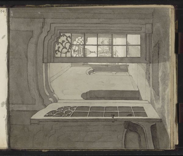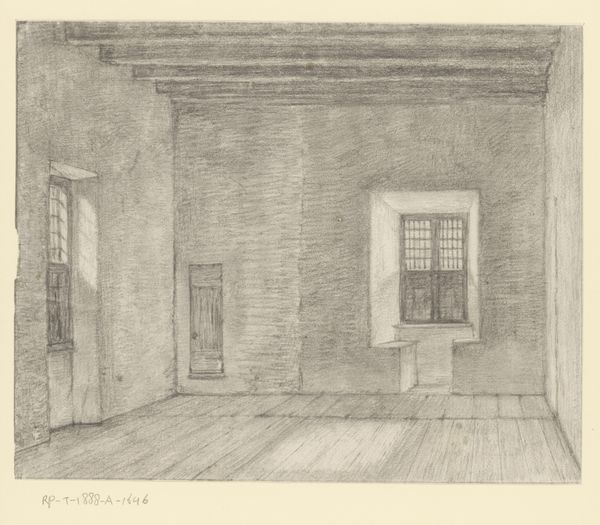 Curator: This photographic reproduction presents an interior scene from Middelburg, dating roughly between 1880 and 1891. It employs techniques like etching and engraving on paper to create its intricate detailing. What's your first impression? Editor: A sense of hushed reverence. The linear precision feels almost architectural. There's something almost stage-like about it, this hushed interior with what seems like the main table and those cathedral-like windows bathing the room in spectral light. I’d call it hauntingly formal. Curator: "Hauntingly formal" nails it, really! It's almost dreamlike how sharply everything is rendered. What do you think is going on in there? It almost feels like a meeting of great importance is to happen in this setting. I imagine secret alliances. Editor: Maybe. To my eye, the severe geometry suggests the institutional. Perhaps a courtroom or guildhall. What I find intriguing is how this composition reflects ideas of power. Note how we, the viewers, are positioned above the space, almost as silent witnesses in some disciplinary exercise. How is social order inscribed into interior space? Curator: Hmm, that top-down perspective… I was thinking observatory deck, but now I'm thinking less scientific gazing and more about surveillance. I do feel a sort of… removed authority. But look at the soft textures of the etching! Even with the rigid lines, there's a strange intimacy in that granular detail. It is like we can enter in it as an intimate ghost that surveys the interior. It does soften that rigid feeling quite much, at least for me! Editor: Perhaps the intent isn't so stark. These depictions of civic spaces often functioned as idealized portraits of the nation itself, carefully curated fictions that promoted an image of social stability and progress to both domestic and foreign audiences. Note, in the back there is some writing displayed up on the wall. Maybe laws? I'm assuming it must have a pretty important purpose and not "just something"... Curator: That could very well be; I just have this unshakeable feeling there must have happened a crime scene for us to arrive here to solve something! Oh, but even if you're right, seeing it this way provides us a whole another perspective that otherwise would never cross our minds. Editor: Exactly! It speaks volumes about how diverse lenses sharpen our appreciation for history.