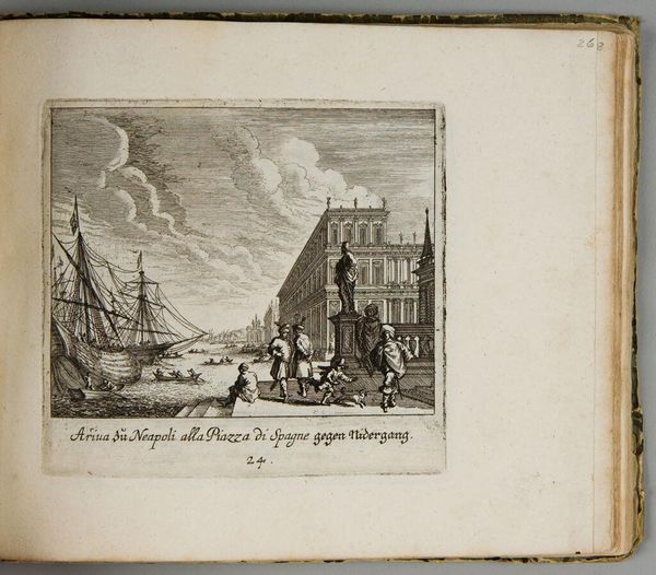 Curator: Melchior Küsel’s etching, “Villa near Naples on the Sea, the Property of the Viceroy,” presents a fascinating interplay of power, leisure, and the natural world. Editor: Oh, it’s a rather severe landscape, isn't it? All those rigid angles of the villa, contrasted against the wispy clouds, it feels…authoritarian. Curator: Indeed. The architectural precision certainly conveys authority. Consider how the villa’s elevated position, overlooking the sea, symbolizes dominion. The Viceroy's ownership is not just territorial, but a visual statement of control over nature itself. Editor: But even with the grand architecture, there’s a certain fragility. I mean, the sea could swallow it all, couldn't it? Perhaps it speaks to the transience of power, how even the mightiest structures are subject to the whims of nature. Curator: That's a very insightful perspective. It reminds us that symbols, regardless of their initial intent, are always open to multiple interpretations. Editor: Exactly! I initially saw severity, but I also see vulnerability lurking beneath the surface.