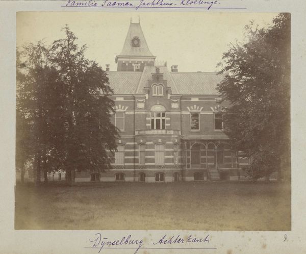 Editor: Here we have "View of the Library of Artis in Amsterdam," taken sometime between 1860 and 1890 by Andries Jager. It's a gelatin silver print, and there's something very serene, almost melancholic, about this image of the library. What stands out to you? Curator: The stillness you observe resonates with the image’s historical context. Photography at this time served an important public role, documenting and classifying. Consider the relationship between the relatively new medium of photography and the zoological garden – Artis. Both reflect a desire to categorize and understand the natural world. How does the composition, particularly the inclusion of trees, frame the role of the institution? Editor: That's interesting, I hadn't thought about that. It does feel intentional, the way the bare trees almost seem to guard the building, setting it apart from nature itself. So the library, with its classification systems, represents an attempt to control nature, perhaps? Curator: Precisely. And consider Artis itself. It was, and is, a space for public education and recreation, designed to display and interpret the animal kingdom. So, how does the act of photographing the library building – the intellectual heart of this zoological endeavor – further shape our understanding of knowledge and public space in Amsterdam at that time? It projects a formal sensibility of European civic design into a broader frame that involves nature and culture, city and science. Editor: I see! It's not just a photograph of a building. It's making a statement about the relationship between science, nature, and the public. Thanks! Curator: It reveals how social institutions actively sought to present a vision of knowledge, progress, and civic pride to the public, using tools as simple as images of buildings in urban spaces. That's something I will remember.
