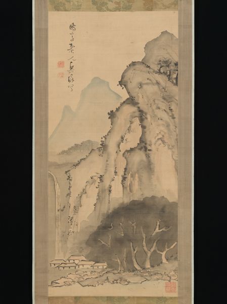 Editor: This is a landscape painting attributed to Kushiro Unsen, created sometime between 1759 and 1799. It’s done with ink and tempera. There's a really peaceful feeling about it. What do you see in this piece, and how does it resonate with its time? Curator: Oh, this one speaks volumes, doesn't it? It’s more than just a pretty picture; it's like a whisper from a world balancing nature and humanity. See how the misty mountains tower over those humble dwellings? There's a reverence there, a dance between the grand and the minute. How do you think Unsen is trying to communicate something about nature? Editor: It’s definitely not trying to be realistic. It seems almost dreamlike, or maybe symbolic of nature being the source of all life? Curator: Absolutely. These weren’t always about photographic reality, were they? Often, Yamato-e style works tried to capture an emotion, or perhaps suggest an ideal. Does it stir something in you, a sense of longing or belonging maybe? It feels a bit like a memory… Editor: You’re right. There’s a definite sense of yearning. I also notice how small the figures are compared to the landscape – are they supposed to feel insignificant? Curator: Insignificant isn't quite the word, but nestled. Connected, maybe even protected by this looming natural force. Perhaps Unsen found comfort in his own version of that interplay? Editor: So, beyond just being beautiful, it's saying something about humanity's place in the world. I didn't realize how much depth something so serene could have. Curator: Serenity is just the surface. Beneath that? A whole universe, just waiting for us to dive in. This painting, much like ourselves, contains multitudes.