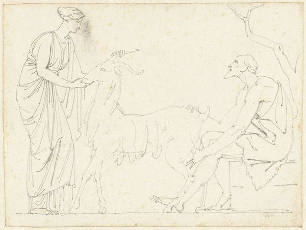 Editor: This is "Minerva Presenting Two Portraits to Apollo," a pencil drawing made sometime between 1625 and 1655 by Eustache Le Sueur. The sketch-like quality makes me think this was perhaps a study for a larger work. What are your initial thoughts? Curator: It's interesting to consider this as a manifestation of artistic labour, isn’t it? A 'preliminary' drawing like this can be so revealing. Notice the grid marks; they speak volumes about the transfer process involved in academic art. This isn't just about divine inspiration, but skilled work. How does the material – pencil on paper – inform our understanding of the final projected piece? Editor: I see what you mean! The grid really exposes the practical side, almost like blueprints. The emphasis on preparation underscores that artmaking isn't spontaneous but constructed. The "preciousness" that we attach to the artwork and artistic persona melts away… Curator: Precisely! And the act of drawing itself was fundamentally tied to knowledge and control, especially in the context of the French academy. Consider also the access to materials; who commissioned this? What determined the quality of paper used? Editor: I suppose it was considered ‘waste material', this preparatory drawing only enabling the final creation? How do you think his Baroque influences factored into the labour aspect? Curator: Baroque art, often commissioned by the Church or aristocracy, frequently obscures the means of production, presenting a finished spectacle of wealth and power. But here, the visible labour embedded in this drawing exposes that illusion. Consider, were there workshop assistants? The distribution of artistic labour is critical to unpacking artistic hierarchy at the time, challenging the Romantic idea of the solitary artist. Editor: That really shifts my perception. I always focused on the narrative elements, but now I realize how important it is to consider this piece in the context of materials, processes, and even workshop economics! Curator: Indeed. This seemingly simple sketch unveils a complex network of labour, value, and social relations deeply embedded in its materiality.