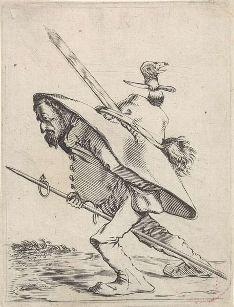 Curator: This spirited drawing by Harmen ter Borch, dating back to 1652, depicts a beared man carrying a rack or ladder, rendered with pen, pencil and ink. What is your immediate response to this sketch? Editor: There's an undeniable sense of burden here, isn’t there? The way the figure is hunched over, weighed down not just by the object on his back, but almost by life itself. I feel empathy looking at him. Curator: Empathy indeed. Consider how ter Borch uses line to communicate form and weight. Note the economy of line, its purposeful abbreviation; a few strokes delineate the figure’s posture, imbuing it with this palpable sense of fatigue. Semiotically, the rack could symbolize labor. Editor: Or even the burdens we carry – perhaps a reference to sacrifice? I see the rack not merely as a utilitarian object but also a cross or symbolic framework, literally and figuratively on his back. The beard, in many cultures, denotes wisdom and experience, hinting at a life lived. It certainly contributes to the feeling that this image holds cultural depth. Curator: Intriguing. The Baroque period was known for such theatricality but there's a restraint here that belies simple symbolism. I am drawn to the compositional choices as well, such as the way ter Borch uses the stark white background to emphasize the figure’s isolation. Notice, too, the deliberate lack of detail in the man's face; this forces us to contemplate him as a universal archetype, rather than an individual. Editor: Precisely, he’s everyone and no one. The angle from which he's depicted adds to this sense of anonymous suffering, further reinforced by his isolation within the frame, which to me serves to enhance that weighty symbolic element. Curator: Well, the efficient syntax of ter Borch’s line, coupled with your evocative reading of his iconography, have allowed us to unearth layers within what seemed a simple sketch, giving us an experience with enduring visual engagement. Editor: It proves how even simple subjects carry powerful echoes over time, when we let them.