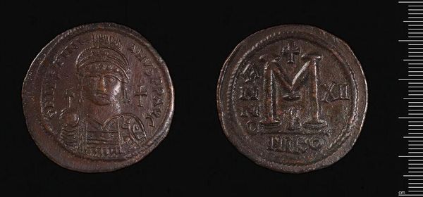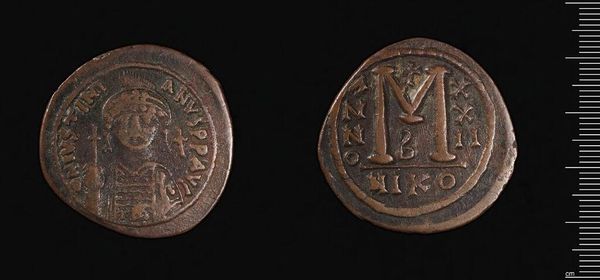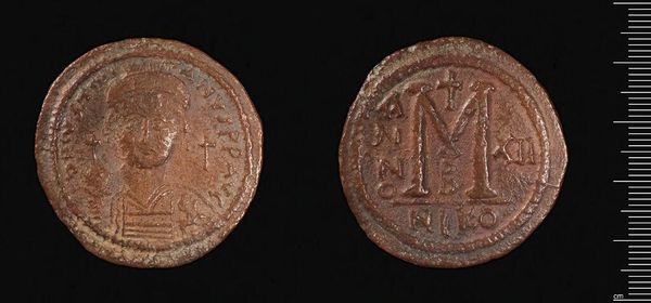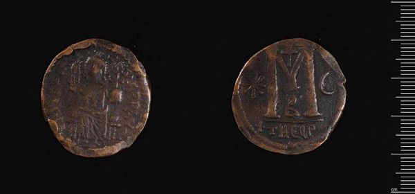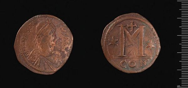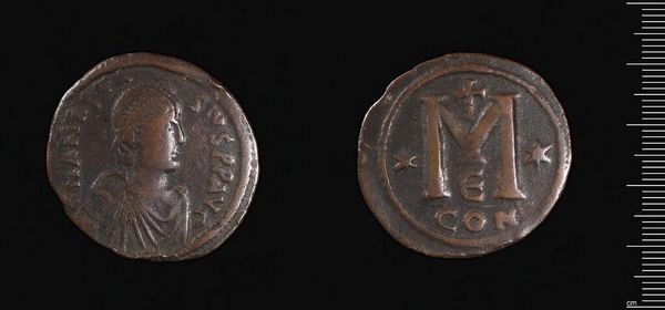 Curator: Looking at this copper coin of Justinian I, I immediately see it as a tangible link to the past, worn smooth by centuries of handling. Editor: Indeed. This object speaks volumes about the Byzantine economy and the Emperor’s power. Coins like these weren't just currency; they were tools of political messaging. Curator: Notice the image of Justinian himself, which was a direct method of communicating imperial authority, but the material itself, this copper, signals something about value and accessibility. Editor: Precisely. Coinage served as propaganda, with each image and inscription reinforcing Justinian’s legitimacy. We see the institutional apparatus of power made manifest. Curator: Thinking of the laborious processes that shaped it, it's interesting to consider who was involved in its creation, from the mining of the copper to the striking of the die. Editor: And how its distribution shaped social interactions. It's a small object, but it embodies the complex interplay of power, belief, and daily life in the Byzantine Empire. Curator: Looking at the worn details, I can't help but wonder about the individual hands it passed through. Editor: A fascinating glimpse into history, certainly.