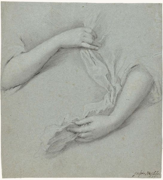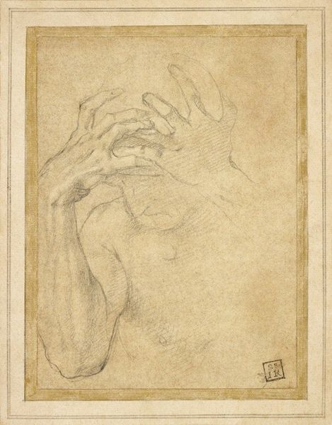 Editor: Here we have Washington Allston's sketch, "Jeremiah's Arm," of indeterminate date. It’s a detailed study in black and white. The arm itself seems to be reaching, or perhaps recoiling. What strikes you about the composition? Curator: The arm, isolated, becomes a study of form itself. Note how Allston uses light and shadow to define the musculature, creating a sense of volume and tension. The hand, almost skeletal, adds a layer of expressive intensity. It begs the question, what is the significance of this fragment? Editor: Fragment? I hadn’t considered it that way. Curator: Indeed. Its incompleteness is essential. Consider the interplay of line and form – how they guide the eye and evoke a sense of movement. Editor: I see the dynamism now. It’s less about what it *is*, and more about how it’s rendered. Curator: Precisely. Allston reduces it to its essential elements: form, light, and movement, transcending the merely representational.