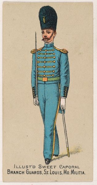 Issued in 1887 by Kinney Brothers Tobacco Company, this chromolithograph on card stock features a portrait of a Lieutenant from the Albany Burgess Corps. The vertical composition emphasizes the figure’s erect posture, immediately conveying a sense of military bearing. The color scheme is dominated by blues and golds that denote status and authority. Notice how the gold accents on the epaulettes, buttons, and belt create a visual hierarchy, drawing the eye upwards. The lieutenant’s towering fur hat both distorts and accentuates the verticality of the figure. The uniform divides the figure into distinct zones which may be interpreted as a symbolic representation of military rank and order. The card functions within the semiotic system of advertising, using the image to evoke associations of strength and sophistication with the Sweet Caporal Cigarettes. The card then, is a complex interplay of visual codes and cultural symbols designed to appeal to consumers in the late 19th century. It is also a historical artifact, reflecting contemporary values and marketing strategies.