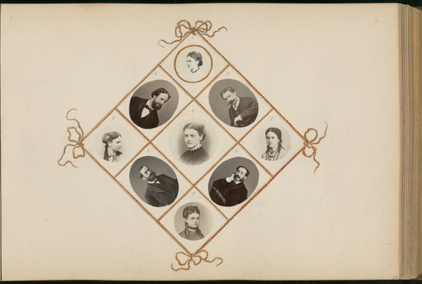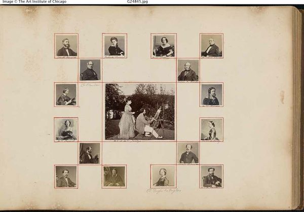 Curator: I’m drawn to the sheer visual structure here; it feels almost mathematical. Editor: Indeed, looking at "The Madame B Album," dating back to the 1870s and currently residing at the Art Institute of Chicago, is like looking at a beautifully organized Victorian spreadsheet! These are albumen prints from photographs of primarily French society members. Curator: Exactly! The repeated shapes and the somewhat muted tones give it an intriguing rhythm. And all those little faces, gazing out with such seriousness, you know? Editor: The albumen process itself is quite fascinating. Egg whites coating silver gelatin, light imprinting images—transforming the material world through chemistry and then carefully hand-placing them onto these grids. It really makes you think about photography less as instant capture and more as meticulous labor. Curator: Absolutely. There’s an intense deliberation, a conscious building of memory and identity here, which each person memorialized contributes to. I keep wondering about Madame B—who *was* she and what relationships did she hold to all these people she wanted to keep in her personal history? Editor: Right? Who held the power to decide who was worthy of placement, and what are the social implications embedded within each photograph in terms of access, cost, and status? I bet each print here also meant labor hours, consumption of resources and materials. Curator: It gives me an almost bittersweet feeling. It's lovely, this effort to preserve moments and relationships, but also speaks to a very particular kind of privilege and a desire to solidify a specific image for the future. Editor: It is so true; thinking about the context, the materials and labor put into constructing this album adds another dimension, especially the implicit power dynamics behind something so seemingly intimate. Curator: Well, looking at it all laid out like this has really reframed how I perceive albums, I can see how objects like this transcend personal history to become something sociologically profound. Editor: Exactly. And for me, it highlights how what seems decorative is rooted in concrete realities—the material circumstances, the tools, the economy required to make even a single image endure.
