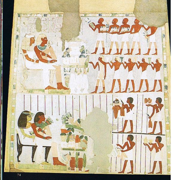 Editor: This is a section of a fresco painting from the Tomb of Nebamun and Ipuky, dating back to 1390 BC. It's quite a detailed scene, isn't it? It shows many figures working, seemingly crafting precious objects. What stands out to you? Curator: I'm struck by the depiction of labor. Note how the painting emphasizes the process and materiality of creation, depicting the artisans engaged in their work. How does it challenge the separation between high art and craft, when considered in relation to its societal use? Editor: Well, it does give a behind-the-scenes look at the creation of what I assume are luxurious goods, implying craftsmanship as being integral. Would these artisans even be seen as 'artists' in their time, or purely labor? Curator: Exactly. It compels us to consider their social status, the consumption of their products, and their conditions of work, which is particularly potent when juxtaposed against the traditional understanding of "art" for elite purposes. Note how little differentiation there is between each figure? How might the means of production and the division of labor be reflected in their depictions? Editor: That’s a really interesting point. They’re presented almost uniformly, their individual contributions seem less important than the collective process. Curator: Precisely! It moves the focus from the individual genius of an “artist” to the collaborative nature of craft production. How does viewing it this way, impact your interpretation of ancient Egyptian art in general? Editor: It shifts my perspective quite a bit. Instead of only considering the finished product and its aesthetic value, I'm now considering the lives and work that made it possible. Curator: A shift that helps us grapple with a more holistic picture of the past. We look beyond royal patronage, directly at the processes and people integral to culture. Editor: Thanks, I never thought about the labor and the modes of production involved in pieces like these before. I learned to appreciate this from a new viewpoint.