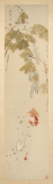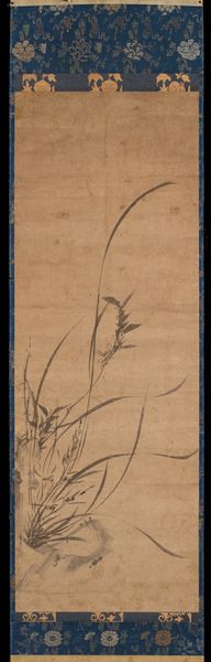 Curator: Here we have "Sparrow on Bamboo in the Rain," a hanging scroll in ink on paper, likely dating from the 15th century. It is now part of the collection here at the Minneapolis Institute of Art, and is traditionally attributed to the artist Muqi Fachang. What's your first take on this one? Editor: My immediate feeling is...melancholy. That little sparrow looks quite exposed. And the washes of ink give a real sense of a damp, chilly day. It also looks deceptively simple at first glance. Curator: Indeed. There's a real sense of Zen emptiness. I almost feel like the aged paper IS the painting, the drawing merely accents this aged canvas, bringing forth nature. I also notice the beautiful floral details along the edges. That looks to be brocade of some kind? Editor: Yes, and consider the paper itself, its production, and likely preciousness at the time. The level of skill required to paint with such intentionality and precision using those raw materials is really incredible. There's a great emphasis on labor there, wouldn’t you say? It speaks to me of trade, skill, preciousness. Not the preciousness of subject matter, but of material. Curator: And there's also that very East Asian artistic convention that an artist is creating an ideal; representing perfection rather than photographic reality. It feels as though it has been captured during a stolen, private moment. As though we've seen something intimate. That is something the artist's touch, their labor has done. Editor: Perhaps it is not so simple as mere labor, either. What's often missed is the socio-political contexts in which works such as this are made. I mean, were we to dig into it, I wonder about the status of the painter, who was commissioning, consuming these sorts of works? To fully analyze its creation, you really can't remove it from systems of power. What were the workshops like where artists were trained in these precise painting techniques? Curator: Ah, yes, absolutely essential questions. Though for me, in a gallery space, in a quiet moment... all that fades into this singular image, this delicate little sparrow in the rain. It reminds me to stay open to both the pain and beauty around me. Editor: And for me, it makes me contemplate the supply chains that lead to that brush touching the paper. Interesting how one little bird can make us go on completely separate tangents!
