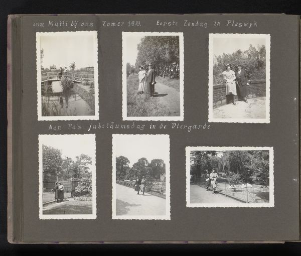 Curator: This gelatin silver print is titled “Wiener Prater, Tierpark Hagenbeck en het Wienerwald,” or in English, “Viennese Prater, Hagenbeck Zoo and the Vienna Woods,” dating to around 1930 or 1931. It is part of a larger compilation created by Berti Hoppe. My first impression is melancholy and intimate. Editor: I’m immediately drawn to the way these snapshots, these modest gelatin silver prints, are compiled on a single page. It is giving me a documentary, historical vibe and suggests a fascinating story. I wonder about Hoppe’s choice of materials: the specific type of paper, the development process... All that contributes to the object's aura. Curator: The way the images are arranged on the page provides a specific, meaningful contrast of themes. We see a progression through leisure. There is Hagenbeck with the elephants which contrasts greatly with nature imagery, trees, a stairway and what appears to be cherry blossoms. The images carry symbolic value—nature represents freedom, innocence and a deeper sense of national pride. Editor: I'm interested in Hagenbeck. That’s very likely reflecting early twentieth-century labor practices related to tourism. These photographs were likely quite accessible and intended for the common person. That idea really gets me thinking about how photography served a democratic purpose back then, even shaping the landscape of leisure and what types of tourism became desirable. The material is, therefore, linked to class and accessibility. Curator: Definitely, the symbolism blends social commentary and an aspirational vision of what a day out might look like during this era. The very arrangement here tells its own story. You have the structured and the wild represented together. It creates a tension, a visual narrative, if you will, regarding nature, human interaction, and cultural norms during this period. Editor: Right! Hoppe likely had complete creative and technical control over how the scenes came to life and how their final compilation would circulate. Curator: And understanding what these places and items symbolize gives us access into that period, its beliefs, and what folks idealized, as well as the potential societal pressures within those ideals. The image feels so much bigger now that we unpacked it together. Editor: Absolutely, looking at the materiality and labor, we appreciate the history embedded in its making and purpose. Fascinating!