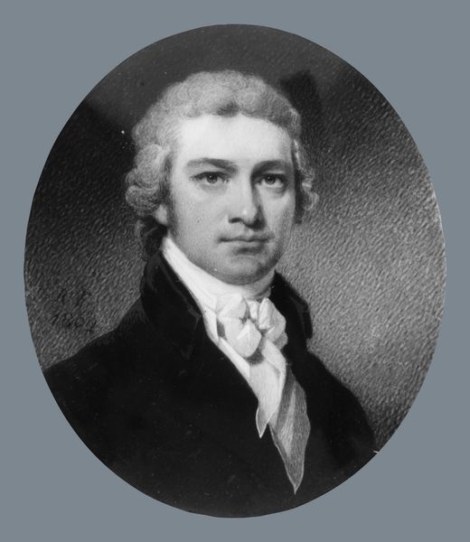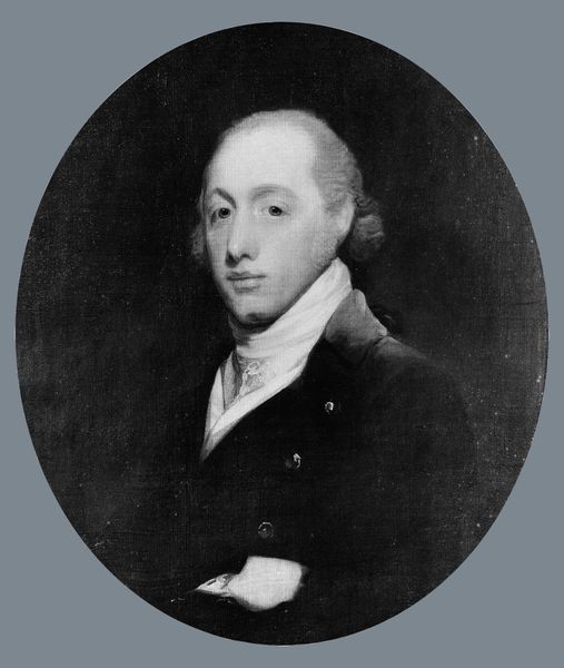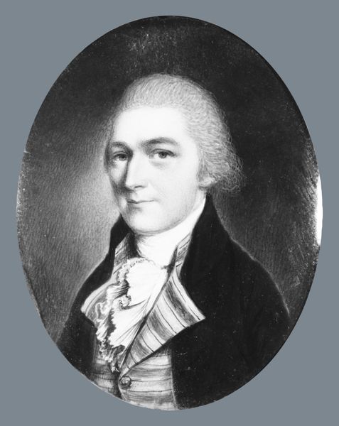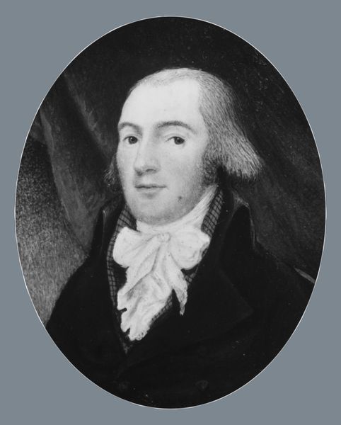 Gilbert Stuart painted "William Kerin Constable" using oil on canvas at an unknown date. The painting's oval format, with its monochromatic tones, presents a study in contrasts—light and shadow interplay across Constable’s face and attire, creating a dynamic visual rhythm. Stuart masterfully uses light to sculpt form, emphasizing the texture of the sitter's powdered hair and lace jabot against the smooth planes of his face and coat. The strategic use of chiaroscuro draws the eye to Constable’s gaze, while the loose brushwork softens the overall composition. This technique not only captures the sitter’s likeness but also reflects the broader 18th-century interest in the subjective and psychological dimensions of portraiture. Through these elements, the portrait achieves a delicate balance between formal representation and an engagement with emerging ideas about individual character and perception.