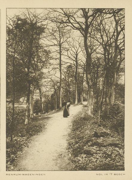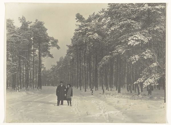 Editor: Here we have a photograph, "Boslaan (Middachter allée) bij De Steeg," created by J.S.J. de Jongh sometime between 1860 and 1890. I'm immediately struck by the almost staged quality, the way the trees line the path so perfectly. It feels a little... constructed. What do you see in this piece from a historical perspective? Curator: That's a perceptive reaction. It is a landscape, yes, but think about how photography was developing as a medium. This wasn't just about capturing a scene. The act of constructing the photograph—posing figures, selecting viewpoints—reflected societal values and ideals. Who was meant to view it and why? Editor: Good question. I see two men in the scene. Would the intended audience be wealthy landowners? Curator: Very likely. Consider the social and political landscape. Land ownership equated to power. Depicting such an ordered, almost majestic pathway suggests control, a taming of nature. This image reinforces a certain idea of ownership and perhaps even alludes to the idea of social order. Editor: So, it’s not just a pretty picture; it’s conveying something about the owners or the social class connected with it. Did the rise of photography coincide with the expansion of these kinds of properties and messages? Curator: Absolutely. The burgeoning middle class gained visual access, so there was a huge public interest. But I would ask if photography changed them? Or was it deployed to make visible existing biases? Editor: Interesting thought! It has really opened my eyes about how a photo can be so much more than just recording something. Curator: Exactly. Hopefully next time you engage with a picture you will not just consider the aesthetics of it, but reflect on its wider purpose within society.