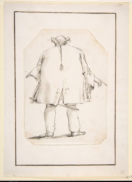 Curator: Let's consider Roelant Savery’s “Man in a Ragged Cloak Walking to the Right,” created around 1608 or 1609, here at the Städel Museum. This drawing utilizes ink and chalk. What’s your initial response to it? Editor: There's an immediate melancholy in this depiction. The hunched posture, the tattered clothes—it speaks of hardship and resilience at the same time. There’s an entire story etched into those lines and I just feel profoundly sad looking at the man's condition. Curator: Indeed. Savery, despite being known for his idyllic landscapes and animal studies, captures a stark reality here. This drawing serves as a social commentary, reflecting the plight of the marginalized during the Renaissance. We mustn't forget the era's brutal socio-economic stratification, where poverty was rampant despite artistic and scientific advancements. Editor: Exactly! It's like Savery momentarily diverted from painting Eden to record a man lost in it. I feel his gaze; it’s devoid of hope. Do you think this character appears in any other work? I feel like if I search Savery's art, he must reappear in different poses. Curator: Savery created quite a few studies of figures from life during his travels, especially when in Prague serving Emperor Rudolf II. It’s entirely possible you could spot variations of the same character reappearing, worked into a more complete scene later. Such studies helped with staffage and other detailed elements in his bigger works. Editor: That’s it—he is not the subject but just staffage! Somehow, even a quick, almost cold chalk sketch still bursts with that human empathy that can make art so damn powerful. For all his Baroque sensibilities, there's a grounded reality here that cuts through any fluff or pretense. Curator: I agree. Though intended possibly for incorporation into a larger landscape or genre scene, the drawing also stands as a remarkable document of its time, challenging romanticized views of the era. Savery’s skill elevates a simple street scene to a poignant observation on humanity. Editor: It certainly invites us to reflect not only on Savery’s craftsmanship but on how societal inequalities resonate across centuries, which might be the point for creating all of those drawings of different people in society. That’s Savery's commentary about society in those years. Curator: Absolutely. The artwork allows for a critical examination of societal structures and the enduring challenges of poverty, issues still relevant today. It pushes past just pure aesthetic and becomes a reminder of our collective responsibility. Editor: So much is in that drawing: the fragility of being and the resilience that simmers even within the cracks. It's hard to unsee it, this drawing.