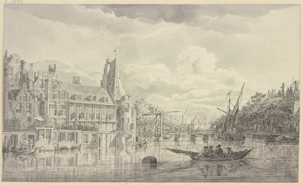Curator: Right then, next up we have Reinier Nooms' "To blokhuse ved Amstel, Amsterdam," an etching dating back to the mid-17th century, specifically somewhere between 1651 and 1654. What jumps out at you? Editor: It's the water, definitely. It dominates everything, reflecting those boxy buildings and the airy sky. Feels almost Venetian, this watery world. Curator: Interesting. Venice of the North, indeed. Nooms was, in fact, a sailor, or at least very familiar with the sea, earning himself the nickname "Zeeman." Editor: Ah, that makes total sense! The maritime imagery is key here. Those blockhouses, or fortifications, appear almost like grounded ships, defending the city but also vulnerable, surrounded. They become symbols of security and fragility existing side-by-side. Curator: The tension there is really captivating, isn’t it? Looking closer, the scene's bustling with small boats, people milling about on the roofs. A real slice of life happening despite the military nature of the structures. Editor: Right. I mean, notice how even the smoke from the chimneys seems…decorative almost? Like another flag being waved. It reminds me that cities, especially port cities like Amsterdam, are about flows—people, goods, ideas all intersecting. And the image itself becomes a symbol for that interconnectedness. Curator: And of course, we are viewing this particular etching, which would have itself contributed to that interconnectedness, with prints as one of the means of spreading the image of the city across borders and time. Editor: Absolutely, it's easy to overlook sometimes, this "pen sketch," but each line has intent—carefully plotted in cultural circulation, and, you know, now preserved and revisited here centuries later. Curator: The city speaks to us. Well, I certainly felt I gained something new to hold on to today. It always amazes me how a single image can ripple outward with new interpretations. Editor: Agreed. And that etching reminds us how essential art is to documenting, yes, but also, creating history, wouldn't you say?