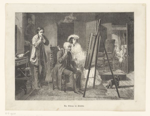 Nicolas Toussaint Charlet made this print, titled 'Schilderles', using lithography, a method that democratized image-making in the 19th century. The process involves drawing on a stone with a greasy crayon, then treating it with chemicals so that ink adheres only to the drawn areas, allowing for multiple impressions. Lithography enabled artists to reproduce their work more easily, reaching a wider audience. In this image, we see a painting lesson, a scene of artistic creation made accessible through a relatively accessible medium. The print's fine lines and tonal variations capture the texture of the artist's studio and the intimacy of the lesson. Consider how lithography, as a means of production, reflects the changing role of art in society, blurring the lines between high art and everyday life. It invites us to appreciate the skill involved not only in the depicted painting lesson but also in the printmaking process itself.