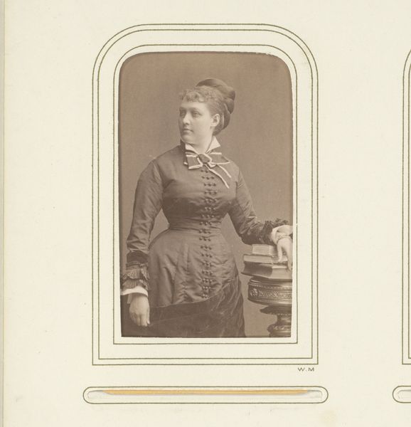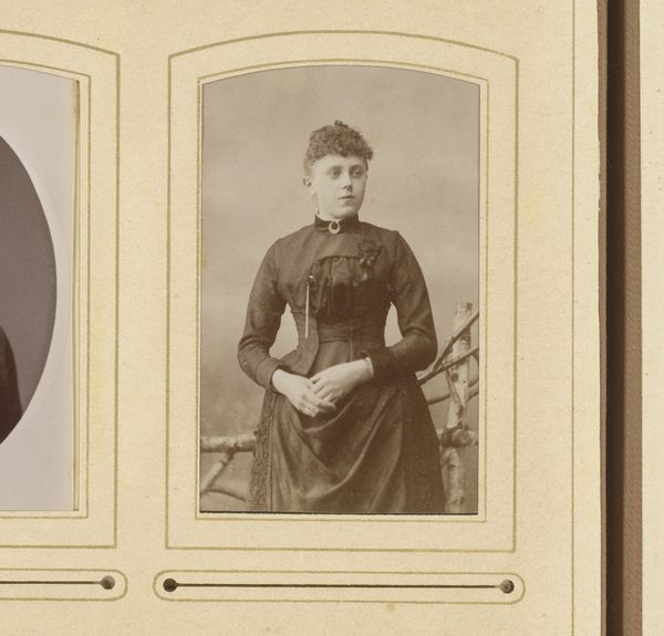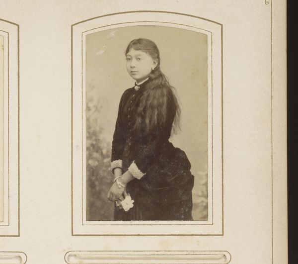 Curator: Here we have a photograph entitled "Portret van een meisje," or "Portrait of a Girl," attributed to Julius Ortgies Jr. Its creation is estimated to be between 1882 and 1900. Editor: My initial thought? Melancholy. There’s something deeply introspective in her eyes. The sepia tones add to that feeling, almost like a faded memory. Curator: Precisely. The sepia tones, common to 19th-century photography, speak to the formal conventions of portraiture. She stands formally by the ornately carved chair; everything feels posed to convey status and dignity. The jewelry around her neck, while minimal, serves as a social signifier. Editor: True, but the composition is quite revealing. The chair, a symbol of stature, is more like a prop for her, you know? It is almost like she isn’t fully comfortable with the formality. Look at how her fingers clutch its edge—there’s a subtle resistance there, as if she yearns for a life beyond the expectations of her class. Curator: That tension between individual emotion and societal expectation is a recurrent theme in many genre paintings from that period. The rigid social structure placed tremendous pressure on young women. This photograph reflects this. Editor: You nailed it. Think about the little details – her sidelong glance, the plainness of the expression versus her outfit, maybe they imply a longing. The weight of her expected role in society makes me sad. Curator: Yes. This form of image production captured a fleeting moment of identity while trying to project timeless values, and those often collide. She becomes a visual signifier for both a historical period and a personal narrative, and you, as a viewer, feel the friction there. Editor: The humanity bleeds through! Okay, now I’m seeing this in layers, like looking at history through a pinhole. Makes me wonder what she was actually thinking...and where is she now? Curator: Indeed, this "Portrait of a Girl" becomes an emblem of remembrance. Ortgies captures not just an image but also a whisper of a story lost to time. Editor: Definitely changes my initial sense of melancholy. Now it's more like hopeful curiosity, fueled by historical awareness and her story. Thanks, historical images can be so captivating.