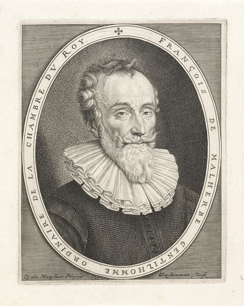 This is an engraving of François de Malherbe, made by Augustin de Saint-Aubin, probably in France, sometime in the late 18th century. Malherbe was a 17th-century poet, known for his classical style and influence on the French language. The image is presented as a portrait within an oval frame, a conventional way to represent figures of authority in that period. Saint-Aubin has carefully rendered the details of Malherbe's clothing and facial features, but more importantly, he is depicting a cultural icon of the French classical age, a period that was very important for the elites of Saint-Aubin's time. This interest in the past was part of a broader cultural movement, driven by the institutions of the French state. The image is not just a record of Malherbe's appearance, it’s an active construction of his cultural status for a later audience. We can understand this function through the study of engravings, portraiture, and the classical tradition in France.
