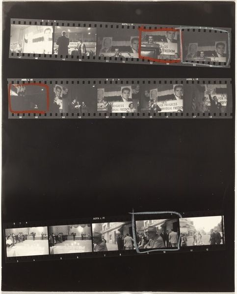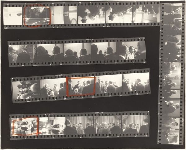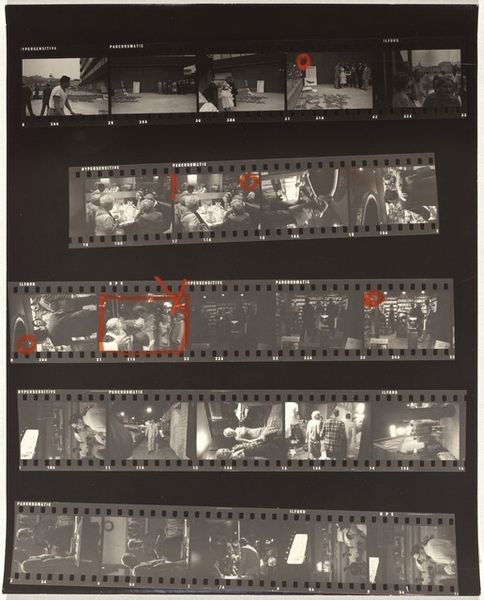 Editor: This is Robert Frank's "Guggenheim 176/Americans 25--Miami Beach" from 1955, a gelatin silver print. The image shows multiple strips of film, like a photographer's contact sheet. It feels a bit fragmented, a series of glimpses. What do you see in this piece? Curator: I see Frank grappling with American identity in a post-war era of superficial prosperity, particularly through the lens of class and race. Miami Beach, at the time, represented leisure and wealth, yet Frank's raw, almost jarring style suggests a critical undercurrent. Consider the carefully chosen frames, marked for potential selection. What do they reveal about his editorial gaze and the societal narratives he aimed to expose? Editor: So, you're saying the choices he makes about which images to highlight, even on a contact sheet, speak volumes? Curator: Precisely. Frank, influenced by social documentary, was keen on unveiling the disparities beneath the shiny surface of American life. The contact sheet format itself breaks from traditional idealized portraits, offering a more unfiltered look at reality and hinting at the process of image-making. What does it mean, do you think, that the chosen images might suggest critique of the very consumerism that Miami Beach embodies? Editor: I guess it's like he's showing the story *behind* the story, the doubts and choices involved in creating a narrative. I'd never considered how much a simple contact sheet could say about power dynamics and social commentary. Curator: Exactly! By showing the editing process, he challenges the supposed objectivity of photography and highlights how images are always constructed with intention. What do you think, after our talk, how can a photographer, simply by showing contact sheets and street scenes, advocate and incite change? Editor: I now understand that photography can expose uncomfortable truths. This piece has definitely opened my eyes to the potential for photographic activism, documenting unseen stories.