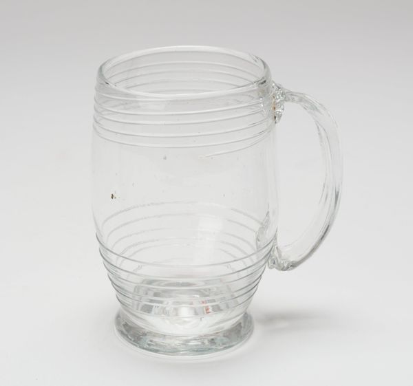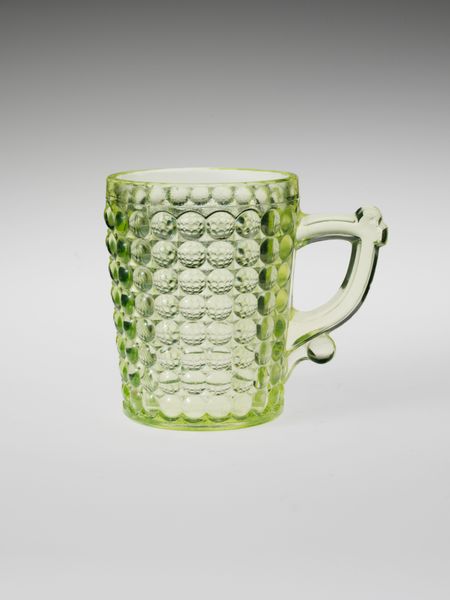 This mug was made out of non-leaded pressed glass by Adams and Company. Though it is difficult to put an exact date on this piece, it may be useful to consider its institutional context. Adams and Company was one of many glass manufacturers based in the United States during the late 19th century. These companies made a variety of glassware, from utilitarian objects like this mug to more decorative pieces. In this era, glass manufacturing had become increasingly industrialized, with new technologies allowing for mass production and lower costs. The rise of industrial production and increasing population created new markets for goods, which in turn contributed to the expansion of transportation networks and the growth of cities. Further research into the history of glass production in the United States as well as distribution networks and cost comparisons would help us better understand the mug's historical context. We can better understand art when we consider the social and institutional context of its production.