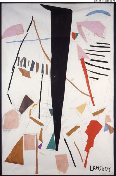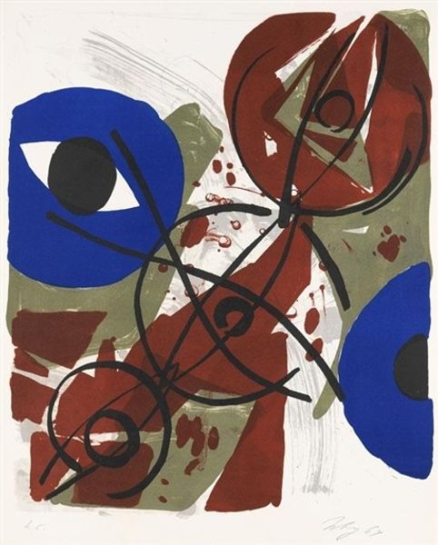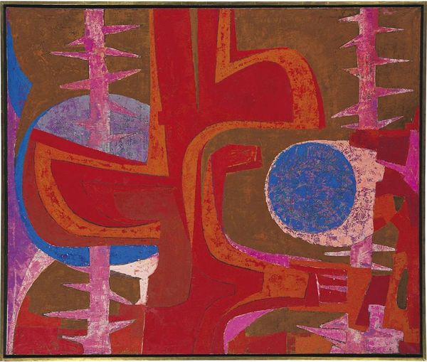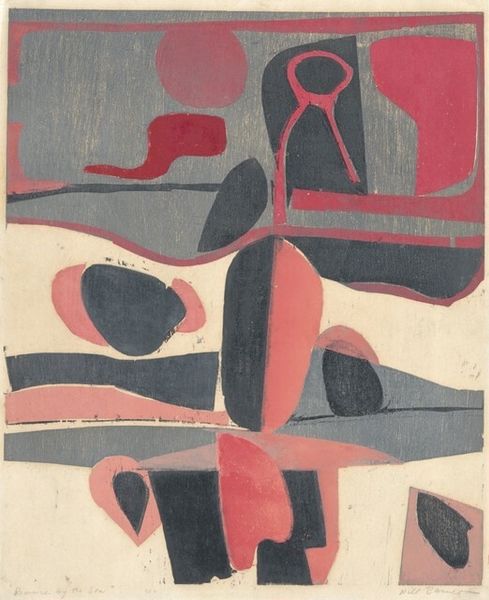 Curator: Ah, the dance of form and color! We’re looking at Will Barnet's "Province by the Sea," a mixed-media print from 1959. What jumps out at you? Editor: Well, there's an undeniable tension here, isn’t there? A stillness, but one pregnant with unspoken possibilities. It’s like the quiet before a storm, rendered in shape and shadow. Curator: Precisely. Barnet's strength lies in orchestrating these subtle balances. The composition, though abstract, evokes a sense of place—a coastal landscape maybe, flattened and reconfigured through geometric lenses. The color palette too... it is not realistic! Editor: I think it hints more than describes. Notice how those horizontal bands, a deep indigo crossed by an orange one, could easily become a simplified seascape, and the arrangement suggests horizon lines. But look how those biomorphic shapes, in shades of coral, disrupt that reading, injecting a note of playful ambiguity. Curator: Barnet was a master of suggestion, walking the line between pure abstraction and representational art. You mentioned the forms— they are fundamental to understanding his language. The artist often employs such pared-down shapes. These recur throughout his career, taking on different meanings and relationships depending on their context. He often uses the same prints with unique coloration or with multiple mediums applied such as monotype and stencil art, as he did with "Province by the Sea." Editor: Absolutely. And consider the medium itself! This mixed-media approach, stencil and monotype techniques, I believe, grant the artwork a unique texture, a sort of layered depth that adds another dimension. Curator: Agreed. I like to consider the negative spaces too. How the areas devoid of pigment almost seem to breathe life into the composition! What does that say of his artistic approach? Editor: Perhaps that for Barnet, what isn't there is just as important as what is, giving us pause and space to consider everything the artwork inspires within us. Curator: I completely agree. And there’s something undeniably powerful in how he’s able to achieve so much with seemingly so little. Editor: It’s a quiet masterpiece, a study in thoughtful arrangement and suggestive form. "Province by the Sea" beckons, doesn’t it?