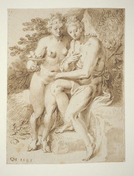Curator: Here we have Francesco Bartolozzi’s "Eros and Psyche," housed here at the Tate. The dimensions are roughly 335 by 337 millimeters. Editor: It’s a dream caught in light and shadow, isn’t it? Like a whisper of a secret. Curator: Indeed. Note the artist's masterful use of line. The red chalk creates a delicate yet precise rendering of form. The composition directs our gaze to the interplay between the figures. Editor: I find myself wondering what Psyche whispers as Eros sleeps, or if she's even real, existing only in his imagination. Curator: Perhaps. The drawing transcends simple narrative, inviting us to contemplate themes of beauty, desire, and the unconscious. Editor: It's a lovely dance between reality and illusion, isn’t it? Food for thought. Curator: Precisely. Bartolozzi's artistry allows us to access the eternal through the ephemeral. Editor: Yes, a reminder that sometimes the most beautiful things are the most fragile.