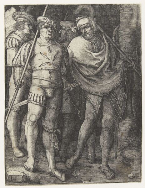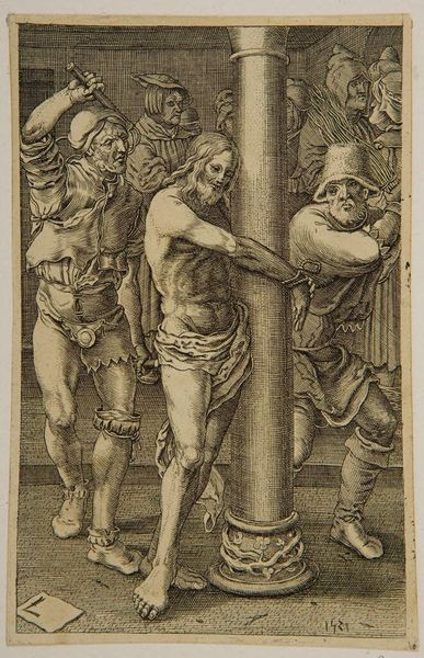 Curator: It's a striking image. What are your first thoughts when you see this print? Editor: So, this is Lucas van Leyden's "The Flagellation of Christ" from 1521, currently held at the Rijksmuseum. It's an engraving, and I’m immediately struck by how incredibly detailed the linework is. It's stark and pretty disturbing. I'm wondering, how does this material and process shape its message? Curator: Exactly! Let's consider the material context: the use of engraving. It's a laborious process, demanding immense skill. Each line is physically etched into a metal plate, then printed. What does this imply about the intended audience and the value placed on the image? Editor: Well, it suggests that this wasn't a cheap, mass-produced image, right? It must have been for a more discerning clientele, who appreciated the craftsmanship and detail involved. Would it be right to suggest then, that print making changed the dynamics between production and consumption in the art world at the time? Curator: Precisely. Engravings, unlike paintings, could be reproduced, making art more accessible, but still requiring skill and resources. This challenges the hierarchy between unique "high art" and more accessible crafts. The meticulous labor involved speaks to the artist's commitment, but also to a growing market for such devotional images. Also, notice the clothing of the figures around Christ - they seem more contemporary than from biblical times. What does this say about the printmaker and the historical narrative presented to the viewer? Editor: That's a very interesting observation - by portraying the figures in contemporary garments, Van Leyden brought this scene of historical brutality closer to his contemporary audience. So, by examining the material and process, we can better understand its intended audience and the shifting artistic landscape of the Northern Renaissance. I appreciate learning about how prints like these expanded both accessibility and cultural reflection on craftsmanship. Curator: Absolutely. And considering prints as multiples created with complex labor, makes one understand that each impression becomes part of a wider economic and social exchange.