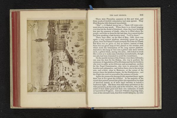 Curator: So, let’s dive into Giacomo Brogi's "Gezicht op de Dom van Florence," dating back to before 1863. It appears to be an albumen print, showcasing the Florence Cathedral. What strikes you first about this work? Editor: Well, I’m drawn to how the image is presented within the open book. It’s not just a photograph, but a photograph within a context. There's a strong textural contrast between the sharp detail of the Duomo and the faded text on the adjacent page, almost like flipping through someone's travel journal. What's your take? Curator: Absolutely. It's essential to consider the materiality of this piece. It's not simply an image of the Duomo, but an albumen print – a specific photographic process that involves coating paper with egg white to create a light-sensitive surface. How does this production method inform our understanding? Editor: It highlights the labour involved in creating and consuming images at that time, versus our instantaneous digital methods now. I mean, preparing albumen prints sounds pretty involved. Does the material inform the cultural or artistic value? Curator: Precisely! Consider how the albumen print elevates photography from a mere reproductive technology to a form of artisanal production. It intertwines science, craft, and art, influencing the reception and economic value of such images. Brogi’s choice speaks to an intent beyond simple documentation. Editor: It's interesting how focusing on the materiality reframes our perception of the artwork. We’re not just looking at a scene of Florence; we are considering the hands-on process and labour through material, as a crafted object consumed by a specific audience. I guess it's less about what is depicted, but HOW it is created and who consumed it that matters most. Curator: Exactly. The "how" becomes as significant as the "what," directing us toward social and economic conditions of its time. Brogi wasn't just capturing Florence; he was participating in a market of consumable images, where the value was as much in the object as the subject. Editor: This makes me see the image in a whole new light! Thanks for pointing out this material aspect; it enriches our understanding. Curator: Indeed! Reflecting on art this way unveils stories embedded within production itself, prompting further inquiries.