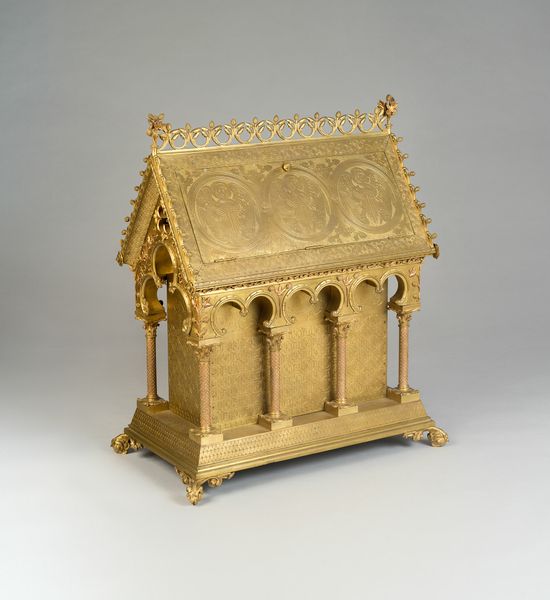Curator: Before us stands a captivating object, a mixed-media metal sculpture from the Art Metal Works company, titled "-German American Bank of Minneapolis- still bank," dating back to the 1920s. Editor: It's quite striking! The gold color and the architectural lines immediately evoke a sense of established power, even in miniature. But the name… given the era, the “German American” designation piques my interest. Curator: Indeed, the title's a portal into history. It reminds us to consider the sociopolitical climate in the U.S. during and after World War I. The name "German American" might have been fraught with tension, perhaps reflecting both pride and a need to assert Americanness amidst rising nativism. Editor: Absolutely. Consider the cultural assimilation pressures during that period, the ways in which German-American identity was both celebrated and scrutinized. This seemingly innocuous object encapsulates a complex negotiation of identity. How interesting that someone felt it valuable to create and save wealth within this framework! Curator: Right, and the form itself, a miniature bank building, suggests the aspirations and values of a community. Banks not only store monetary resources, they function as anchors of power within communities, setting down architectural roots for those within and declaring permanence to those without. Editor: The Art Deco style enhances this further, representing modernity and prosperity. Yet the "still bank" nature is interesting. There’s something profoundly pedagogical about instilling financial responsibility at a young age by teaching an appreciation for material things as embodiments of progress, safety, and security. Who are we excluding by making them small or denying access through other means? Curator: That brings up questions of access, opportunity, and the societal narratives around wealth. Who could afford to save? Who was being encouraged to save? This sculpture operates on so many levels – as a financial tool, a decorative piece, and a loaded historical artifact. Editor: Looking at it this way enriches the piece immeasurably. A beautiful, concise piece ripe with implications on personal liberty as told by the relationship between a commercial enterprise and its base of customer support. It is in reality far from an isolated object. Curator: Agreed. These miniature architectures are never truly miniature in what they express of ourselves!