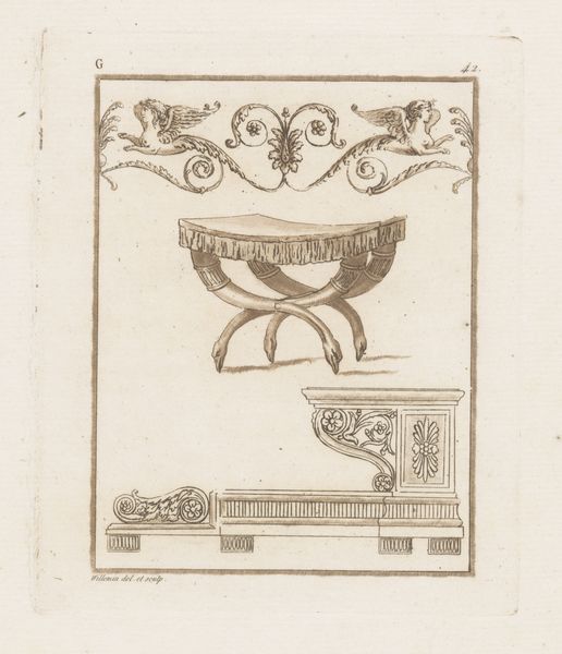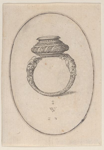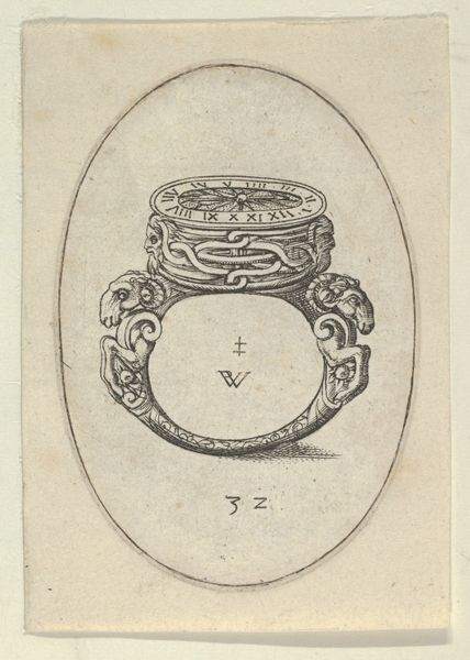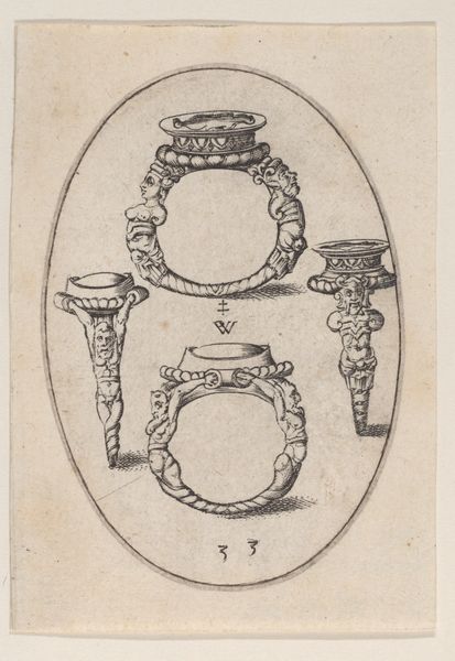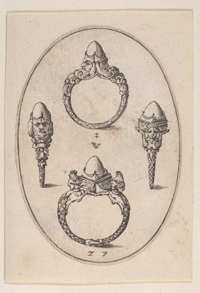 Curator: It has a sort of whimsical weightiness, doesn't it? Almost like holding up the world in your ring. Editor: Precisely. What you are sensing is intrinsic to “Design for a Ring, Plate 30 from 'Livre d'Aneaux d'Orfevrerie'”, dating back to 1561 and crafted by Pierre Woeiriot de Bouzey II. Its medium is a dance between etching, engraving, drawing, and print, presenting a miniature tableau within an oval frame. Curator: A dance indeed. The human figures, almost acrobatic, remind me of dreams where bodies bend to the unbelievable. And they seem to carry so much responsibility with such composure. Or is it resignation? I can't quite tell. Editor: Observe how the figures, mirroring each other in a chiastic structure, bear the weight. The plinth is meticulously detailed with acanthus leaves, signaling Renaissance ideals and perhaps wealth, culture, and a legacy, all balanced on those straining shoulders. Their postures indicate clear formal awareness and technical skill in conveying musculature and tension. Curator: But who are these beings? Are they Atlas figures stripped of their starry sky and given mere foliage instead? Maybe it's a commentary on our ambitions - this grandeur, this ornament that ends up resting heavily on ordinary lives? Editor: They become allegorical, signifying a load of responsibility. Through their near-identical mirroring and circular composition, this Renaissance artwork suggests cycles, repetition, the perpetual strain of status, or maybe merely, a celebration of symmetry and ideal proportions in a work that shows remarkable engraving finesse. Curator: It makes you wonder, doesn't it? What we choose to adorn ourselves with and at what cost? Editor: And further reflects on what makes historical design profoundly and perpetually evocative, a visual riddle posed across centuries.
