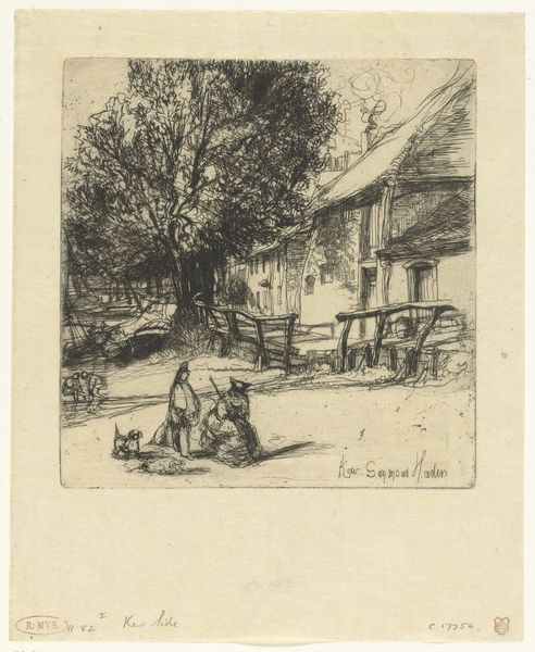 Curator: The mood that pervades "Boerenkar bij boerderij" immediately strikes me as melancholic, perhaps a reflection on rural life, especially given its small scale and monochrome palette. Editor: Chris Snijders crafted this etching sometime between 1891 and 1943. We see what looks like a traditional thatched-roof farmhouse. A horse-drawn cart occupies the foreground, a lone figure stands by the farmhouse door. For me it speaks to a narrative, but what stands out to you in the visual language of this artwork? Curator: The contrast of light and shadow is definitely the main technique here. The etcher masterfully uses short lines to suggest form and texture. The composition itself is interesting. I'm seeing an idealized scene of labor – not exactly the back-breaking reality, wouldn't you agree? It brings to mind how "genre paintings," as it's labeled, were often used to subtly promote certain ideologies about labor and class structure. The pastoral scenes served a distinct social purpose. Editor: Absolutely. This interplay is quite striking, especially when we analyze the texture of the farmhouse versus the smooth lines depicting the cart. I would argue that we are not given all of the details, encouraging contemplation as the viewer connects with the humanistic spirit captured by the scene. This lends itself to a sense of immediacy and the temporal condition of rural working class life. Curator: Thinking about it that way is useful. What stands out in the work is how it attempts to grapple with representing rural society, while maybe unconsciously participating in creating its own social narrative. The realism style that's been associated with the etching does offer the opportunity to bring those issues front and center and opens up to thinking about labor and representation intersectionally. Editor: Indeed. Its very construction becomes an invitation for dialogue. It makes this seemingly simple composition profoundly complex. Curator: Right. I won’t look at an idyllic farm scene the same way again. Editor: Nor will I!