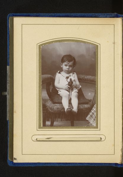 Editor: This is "Portrait of a Baby on a Chair," taken between 1890 and 1910, by Willem Gerhardus Kuijer. It looks like an albumen or gelatin-silver print, mounted in an album page. It has a wonderfully somber feel to it, despite its innocent subject. What stands out to you in this work? Curator: It's fascinating to consider this image as an artifact, embedded within a system of production and consumption. Look at the props – the upholstered chair, the child's clothing. These speak to the sitter's class status and the industrial processes that made them available. Consider the photographer too; did they own a studio? Who was their clientele? The gelatin-silver or albumen printing process, each has its own material requirements, from the photographic paper and chemicals. Editor: That's a great point! I hadn’t considered the material implications of even the chair. So you’re saying that everything, even seemingly innocuous elements like furniture and clothes, represents larger forces at play? Curator: Exactly. Think about the labour involved. The making of the photographic chemicals, the harvesting of the materials to make the album, even the manufacturing of that child's clothing. Who profited from these processes, and under what conditions were these goods produced? Editor: It gives me a whole new perspective! The portrait isn’t just of a baby, but also of a moment in economic and industrial history. So, what could a photograph like this say about craft versus industry in the late 19th century? Curator: Photography was a relatively new medium that was rising during a time where social status started to get captured and shared in these novel ways, yet we are reminded that, this one click of the button comes from so much labor throughout the entire process to that moment in time, questioning photography as “art.” Editor: I never thought about photography in relation to materiality and labour this way before. Thanks! Curator: My pleasure. Looking beyond the aesthetic is crucial. Now I am curious as to what else we can apply this perspective on.